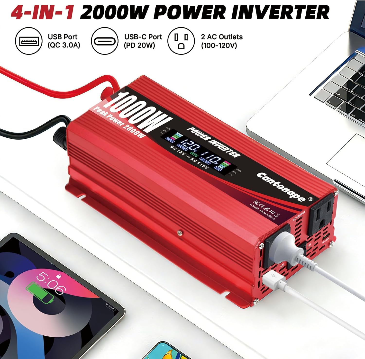 1000W CAR POWER INVERTER: The Cantonape Power Inverter offers a continuous DC to AC power supply of 1000W, convert power from 12V to 110V/120V, with a peak surge of 2000W during load startup. Featuring 2 AC outlets, 3.0A USB port and 20W Type-C Port for multi-purpose charging.