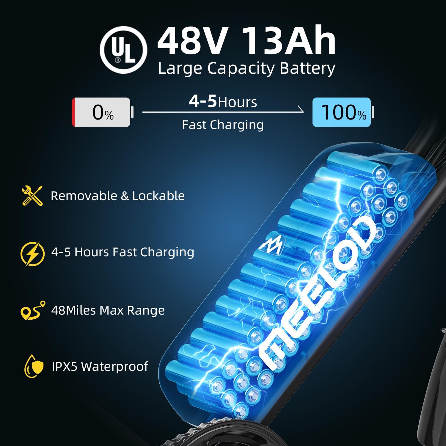 48V 13Ah removable battery offers up to a 45-mile range, easily covering daily commutes and weekend errands.
