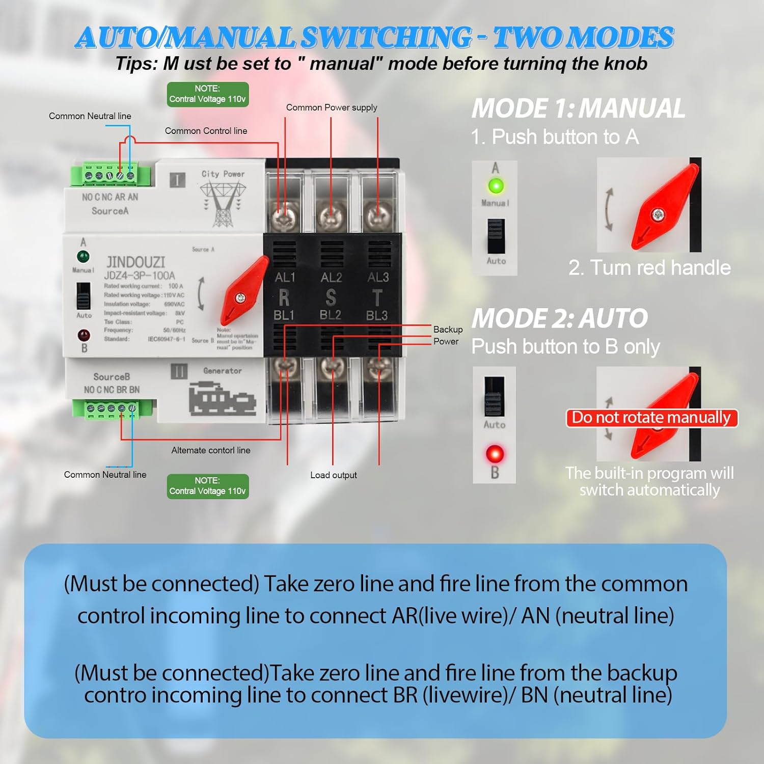 DUAL POWER AUTOMATIC TRANSFER SWITCH: This 100A automatic transfer switch is designed for power systems such as generators and non photovoltaic backup power sources, with millisecond level power conversion function. When the main power supply fails, it can quickly switch to the backup power supply within 0.05 seconds to ensure the continuity, reliability, and safety of the power supply. When the public power supply returns to normal, it will automatically switch from the backup power supply to the main power supply. Simultaneously supporting manual operation, making power switching more flexible and convenient.