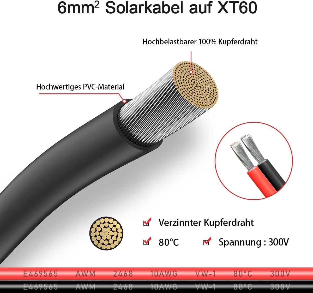 [Solar Panel Cable] This XT60 to Solar Panel Connector Cable use 10AWG Tined Copper UL2468 Certified Wire with high quality PVC nylon material. Tined Pure Copper has low resistance, antioxidant, anti-corrosion and good electrical conductivity, providing stable current for your device.