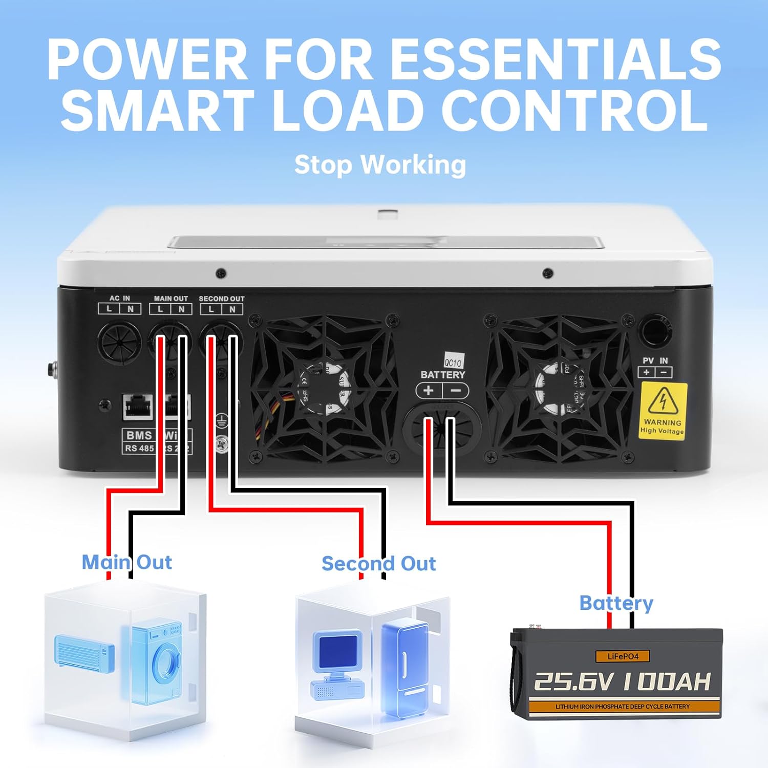 SMART POWER MANAGEMENT: Built-in 3600W inverter and 120A MPPT controller deliver up to 98% charging efficiency. Automatically switches between solar and grid power to keep your system running nonstop. When battery is low, it prioritizes essential devices like fridge and router by shutting off high-power loads—making off-grid living smarter