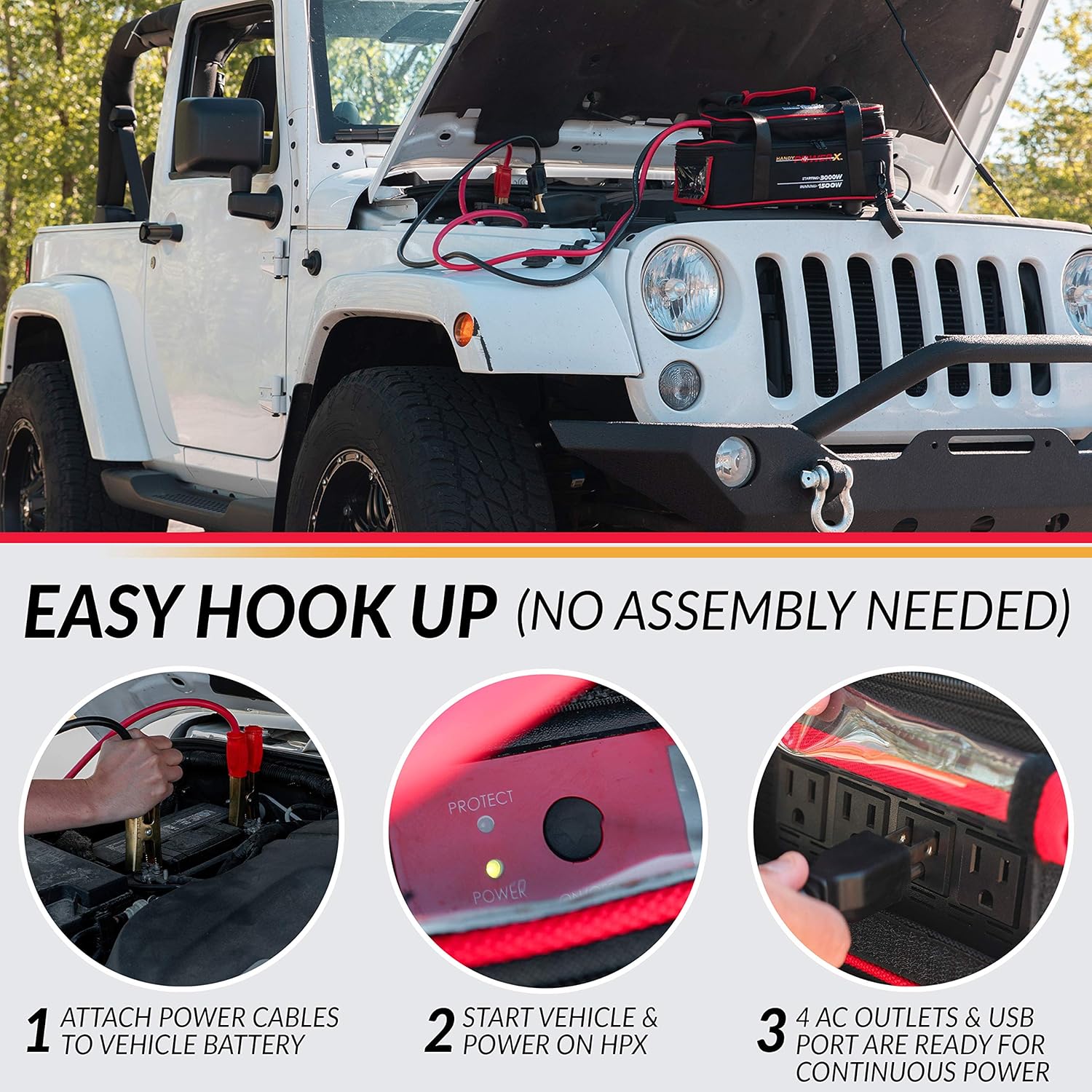 MULTI-PROTECTION: HPX comes with several built-in protection alerts for low battery, over voltage, overload, over temperature or short circuit protection and will automatically shut off for your safety. Protecting you, your car, and items plugged into the power converter.