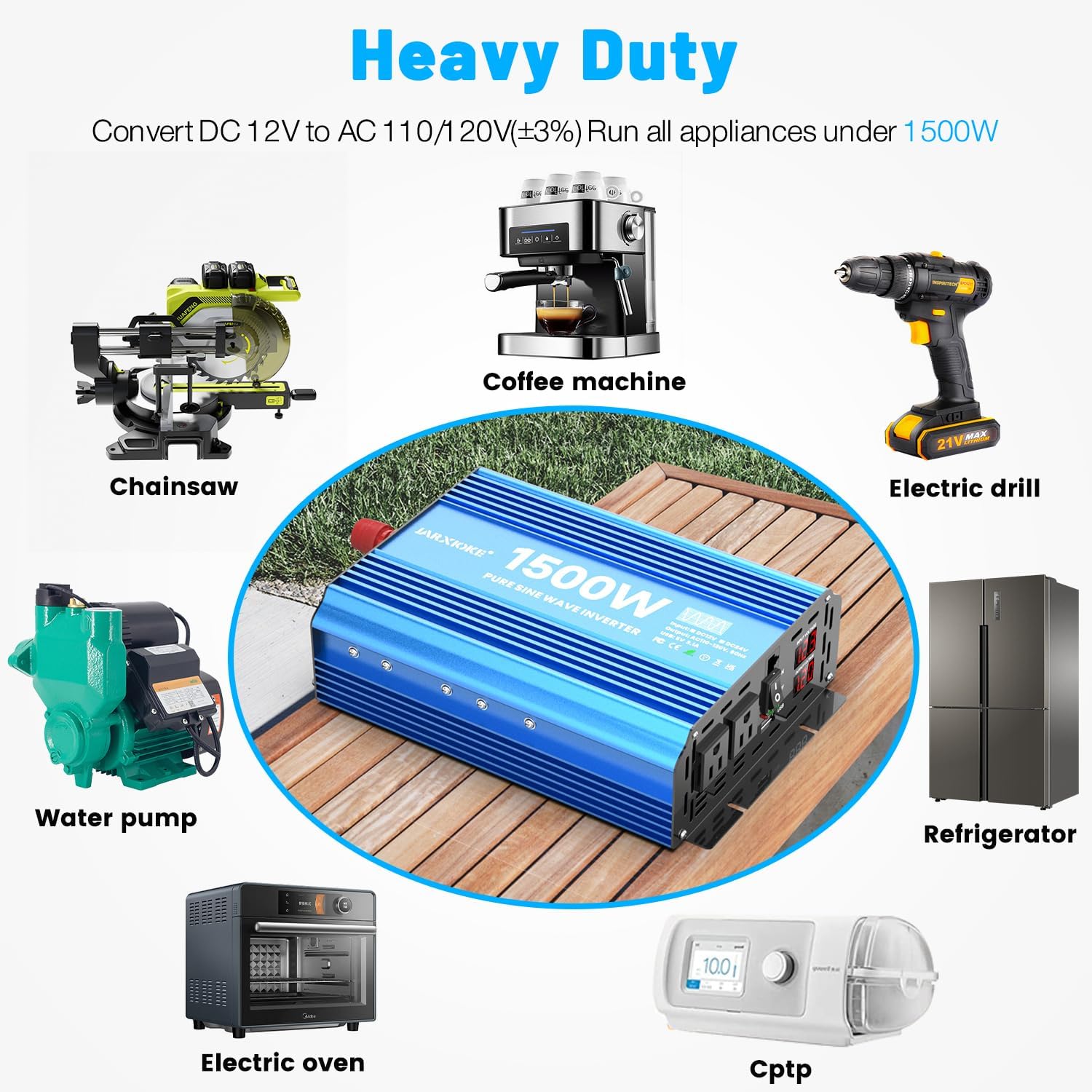 ☀ [Upgraded Pure Sine Wave] JARXIOKE inverter delivers 1500W continuous and 3000W peak power. 12V to 110/120VAC Pure Sine Wave technology has a high conversion efficiency (>90%) and low no-load loss, which saves more energy.