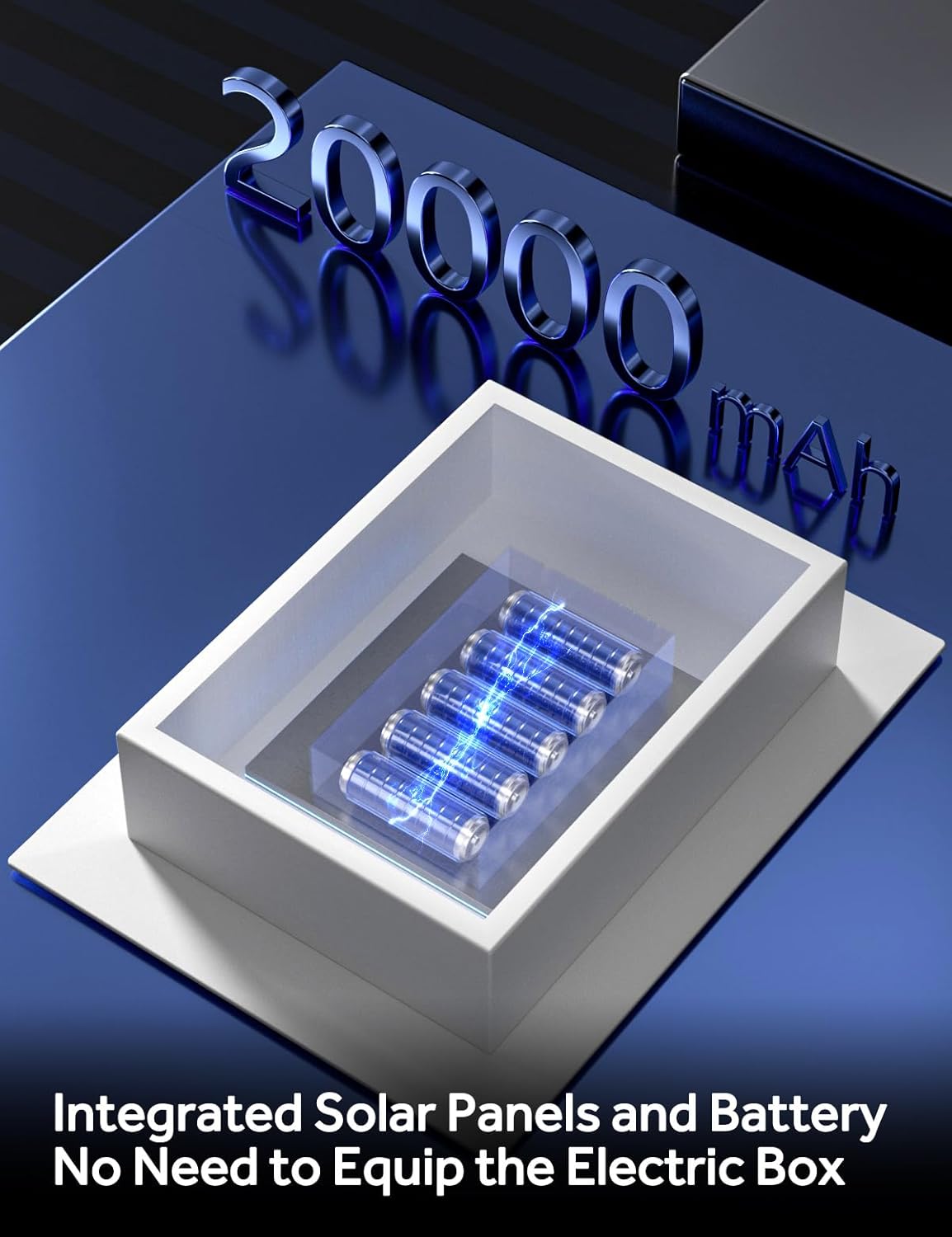 LiFePO4 Rechargeable Battery – 20000mAh rechargeable battery is built-in this solar battery charger, integrated solar panels and battery design let you don’t need to equip an electric box, the LiFePO4 battery has up to 1000 cycles of charging