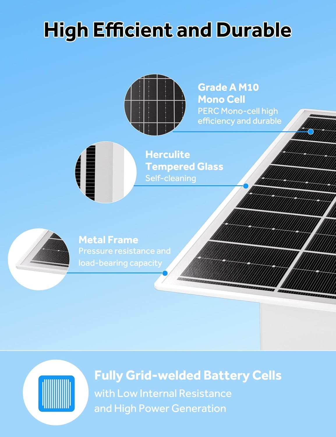 15W + 24% High Conversion Rate – This 15W solar panel kit with Grade A M10 monocrystalline cell has an excellent cell efficiency of 24%. You can fully charge the solar panel battery in under 6 hours. There is no need to worry about WiFi camera power shortages