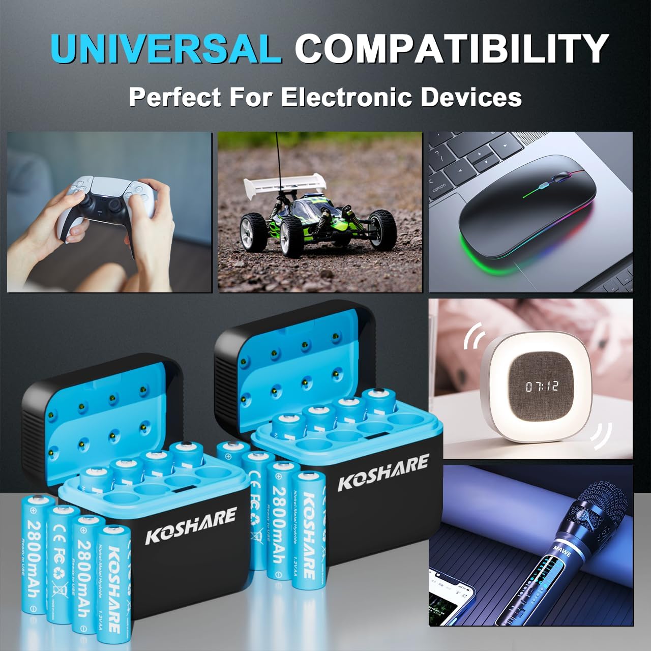 【Widely Compatible with Electronic Devices】 KOSHARE rechargeable AA batteries are made from nickel-metal hydride material, providing stable discharge voltage and compatibility with a wide range of devices. They are perfect for high-performance electronic devices such as game controllers, VR controllers, doorbells, cameras, flashlights, door locks, microphones, radios, children’s toys, alarm clocks, weight scales, blood pressure monitors, etc.
