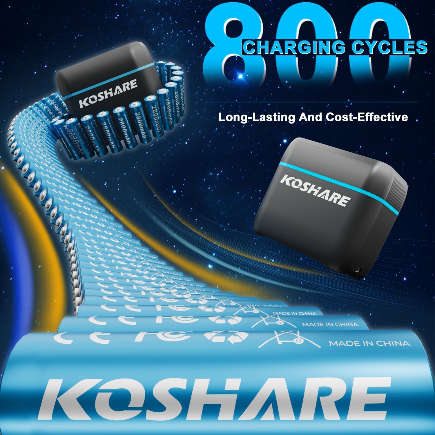 【Ultra Long 800 Cycle Life】 KOSHARE rechargeable nickel-metal hydride batteries are carefully designed to be extremely durable and can withstand up to 800 charge and discharge cycles. With no memory effect and a very low self-discharge rate, they not only support numerous charge and discharge cycles but also ensure a long lifespan, allowing you to save substantial costs.