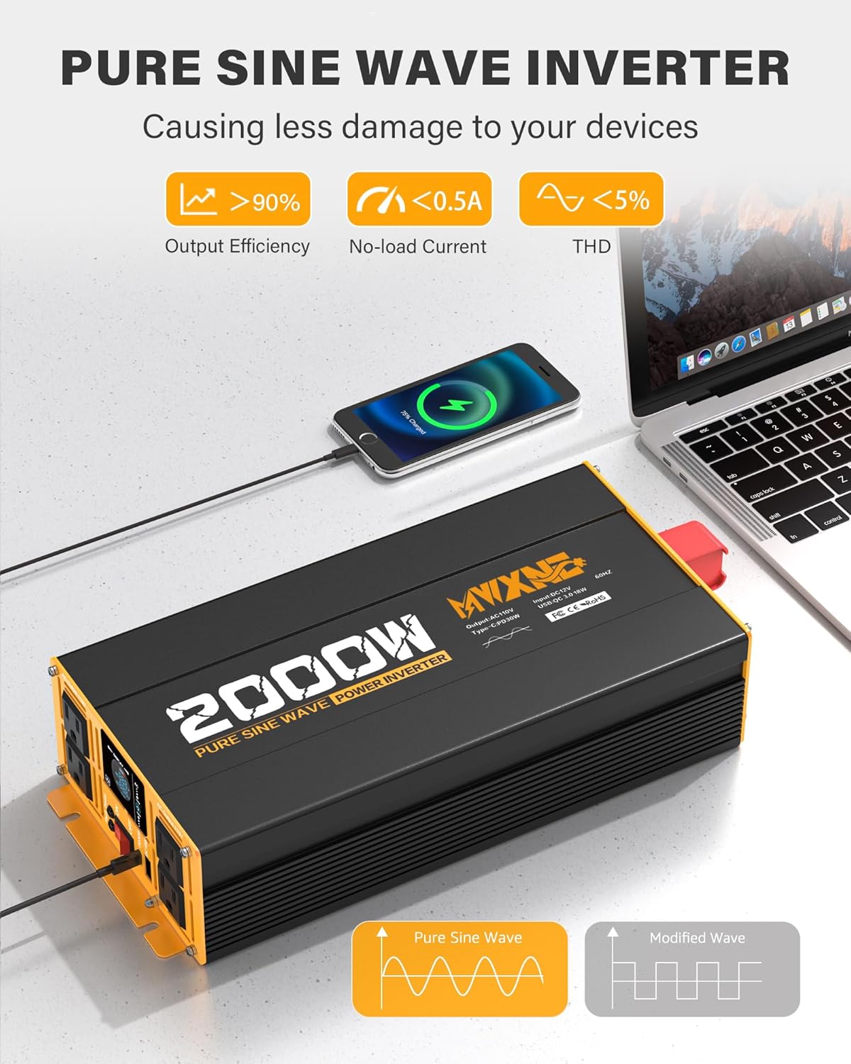 【POWERFUL 2000W INVERTER】MWXNE inverter 12v to 110V 120V provides a continuous PURE SINE WAVE power of 2000W, with a peak surge of 4000W during load start-up. The power inverters have a conversion efficiency of over 90%, reducing conversion loss.