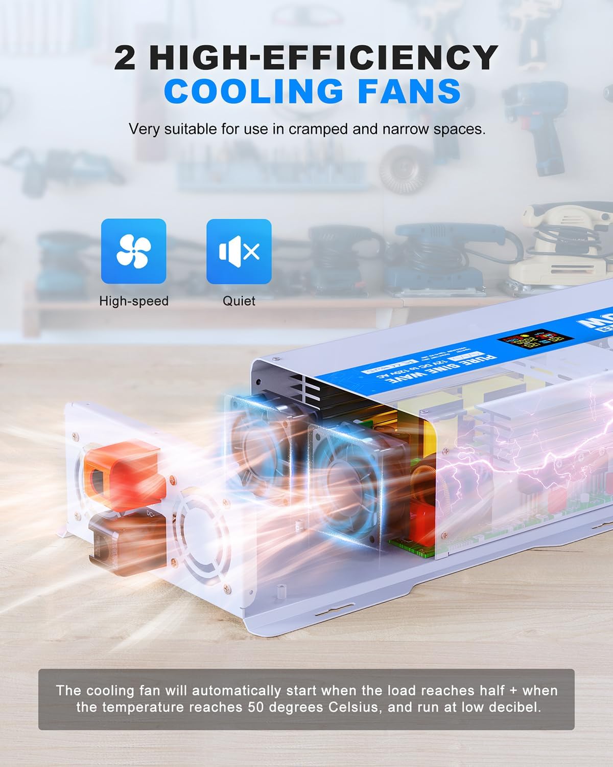 【PURE SINE WAVE INVERTER】It has high-quality power comparable to the output waveform of commercial power, suitable for inductive and capacitive loads, and can protect and extend the life of your electronic devices such as laptops, lights, TVs, refrigerators, stereos, etc. With the high load inductance, it has no humming sound when turning on the device, ensuring quiet and smooth operation of the device.