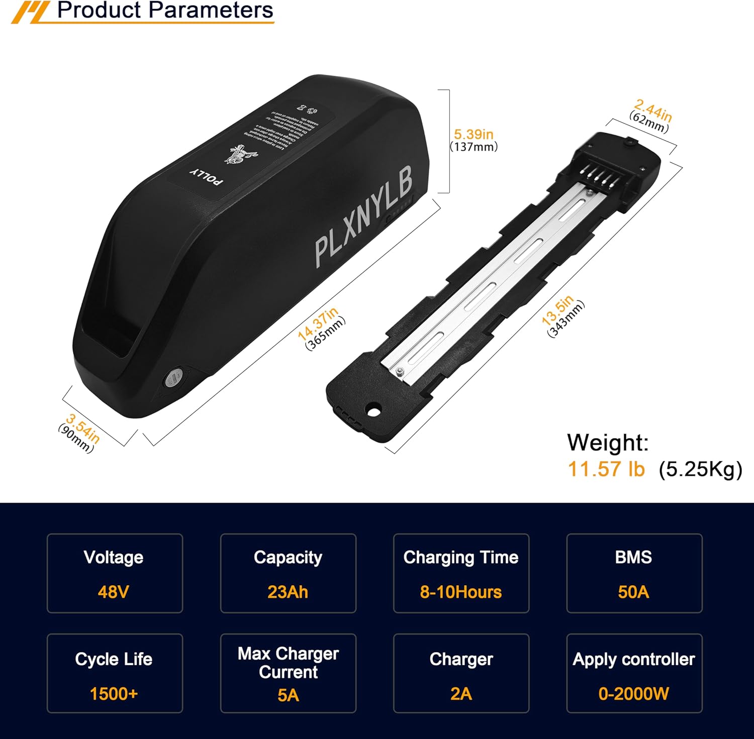 【23AH Battery Parameters】 This electric bicycle battery is 48V23AH, 14.47×3.7×4.17 inches, weighs 8.95 pounds, compatible with all 0-2000W motor and controllers, it suitable for 2A chargers.