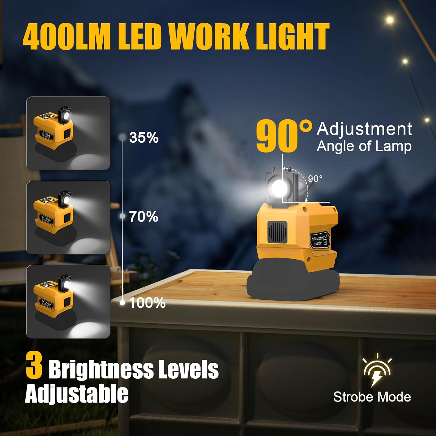 [Applicable Battery Models]: This power inverter is compatible with De-Walt 18V/20V lithium batteries (e.g., DCB206, DCB205, DCB204). With this battery inverter, provides portable power for outdoor adventures or emergency needs—anytime, anywhere. (Battery not included)