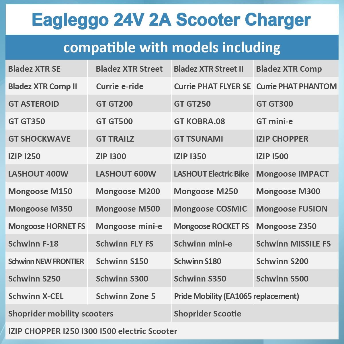 Bladez XTR SE,Bladez XTR Street,Bladez XTR Street II,Bladez XTR Comp,Bladez XTR Comp IICurrie e-ride,Currie PHAT FLYER SE,Currie PHAT PHANTOMGT ASTEROID,GT GT200,GT GT250,GT GT300,GT GT350,GT GT500,GT KOBRA.08,GT mini-e,GT SHOCKWAVE,GT TRAILZ,GT TSUNAMIIZIP CHOPPER,IZIP I250,ZIP I300,IZIP I350,IZIP I500LASHOUT 400W,LASHOUT 600W,LASHOUT Electric BikeMongoose IMPACT,Mongoose M150,Mongoose M200,Mongoose M250,Mongoose M300,Mongoose M350,Mongoose M500Mongoose COSMIC,Mongoose FUSION,Mongoose HORNET FS,Mongoose mini-e,Mongoose ROCKET FS,Mongoose Z350Pride Mobility (EA1065 replacement)Schwinn F-18,Schwinn FLY FS,Schwinn mini-e,Schwinn MISSILE FS,Schwinn NEW FRONTIERSchwinn S150,Schwinn S180,Schwinn S200,Schwinn S250,Schwinn S300,Schwinn S350,Schwinn S500Schwinn X-CEL,Schwinn Zone 5Shoprider mobility scooters,Shoprider ScootieIZIP CHOPPER I250 I300 I500 electric ScooterAlso Suitable for most other electric scooters with 24-volt Electro Drive propulsion system