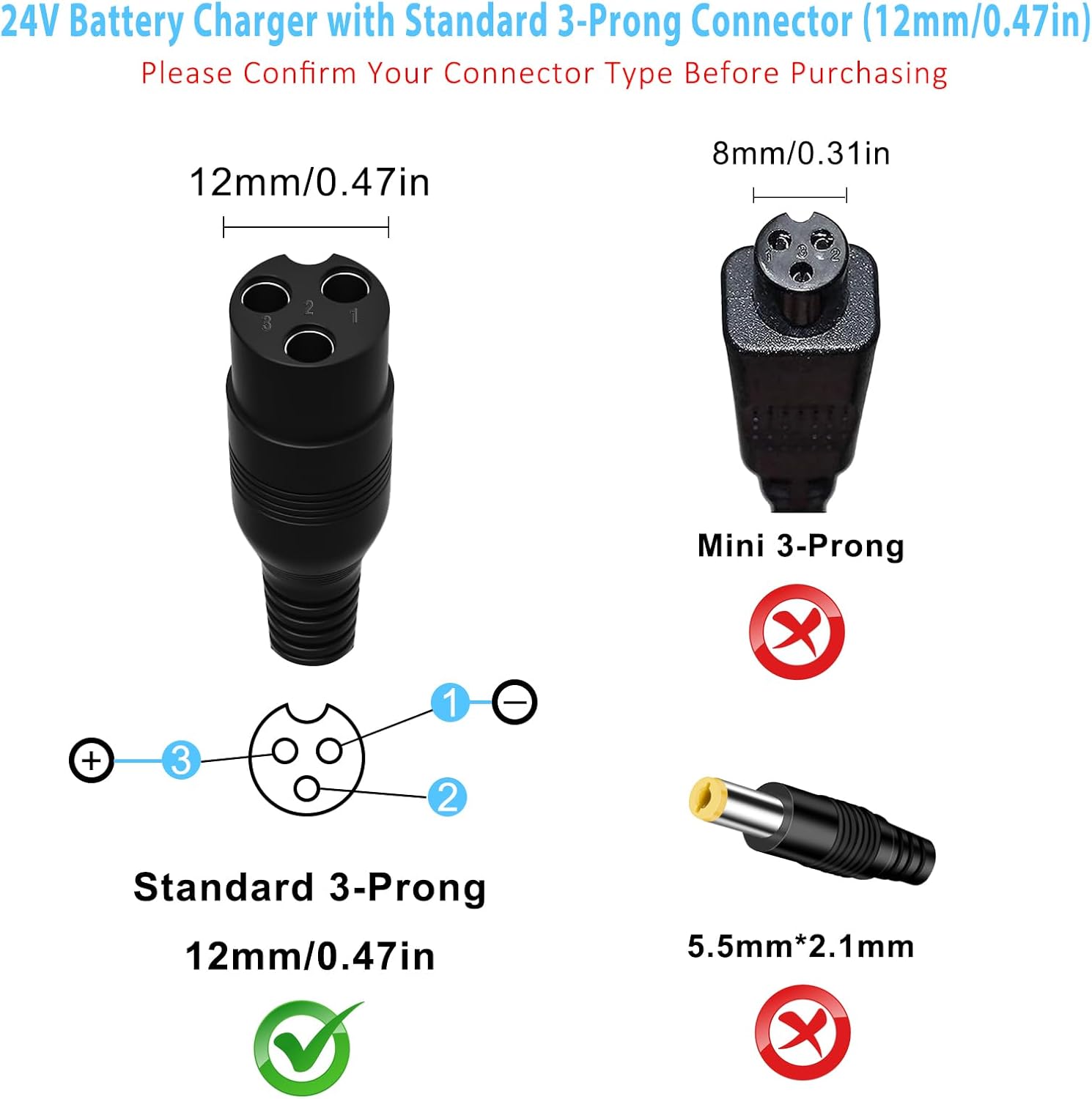 【Specification】: Input: AC 110-240V 50/60Hz; Output: DC 24V 1.5A; 24V electric scooter charger 3 prong Inline Female Connector. Diameter of the plug is 0.47inch.Cable Length: 6.6FT.