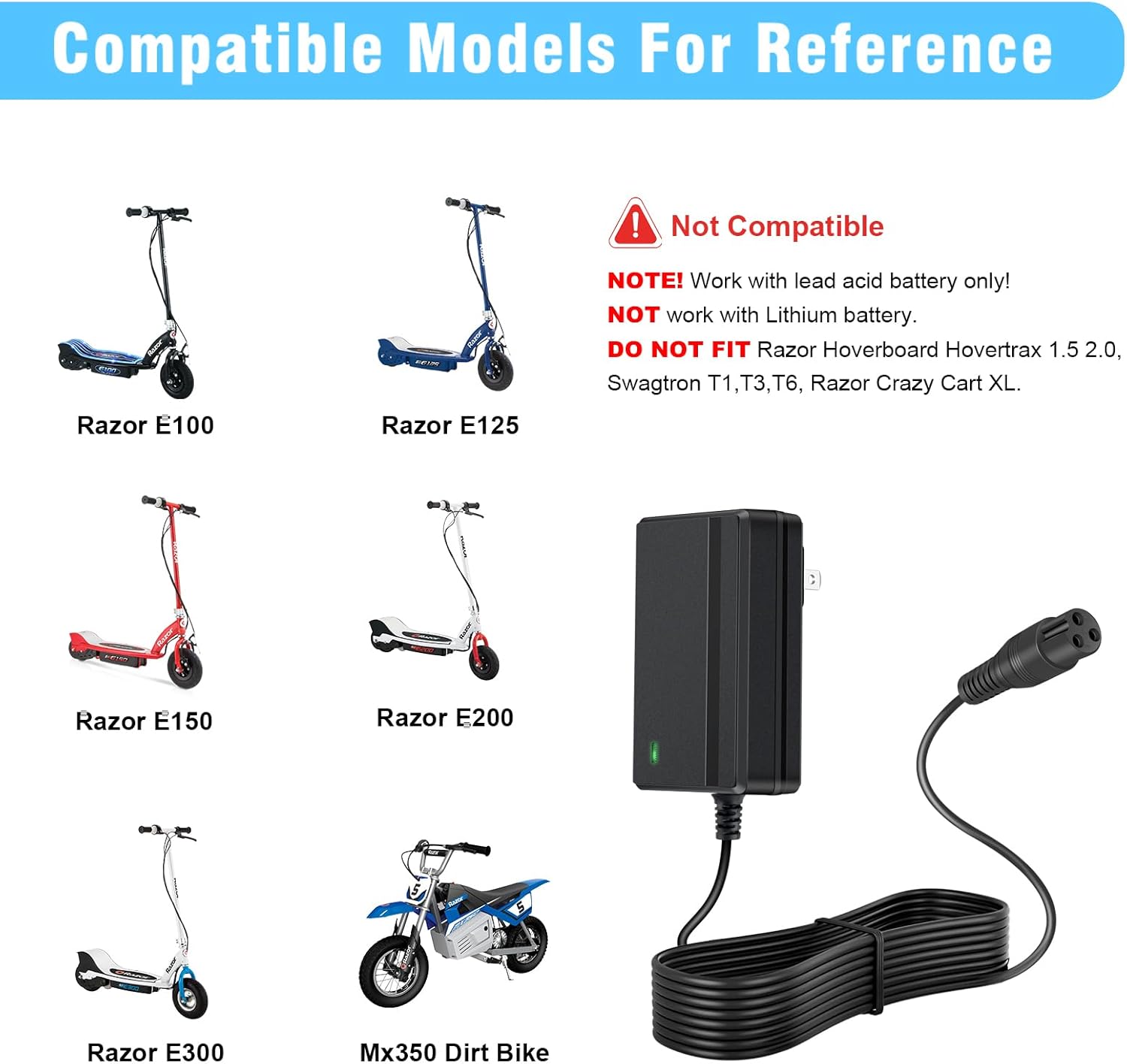 【 24V Razor Scooter Charger Compatible Products】: 24V 1.5A Electric Scooter Charger Compatible with Razor E100 E200 E300 E125 E150 E500 E175 PR200 MX350 Dirt Bike Pocket Mod Sports Mod Dirt Quad Sport Bike Mini Chopper Razor Scooter Charger. Please notice: Only use for lead acid battery, do NOT fit razor hoverboard hovertrax 1.5 2.0. Please check your battery or device model before purchasing