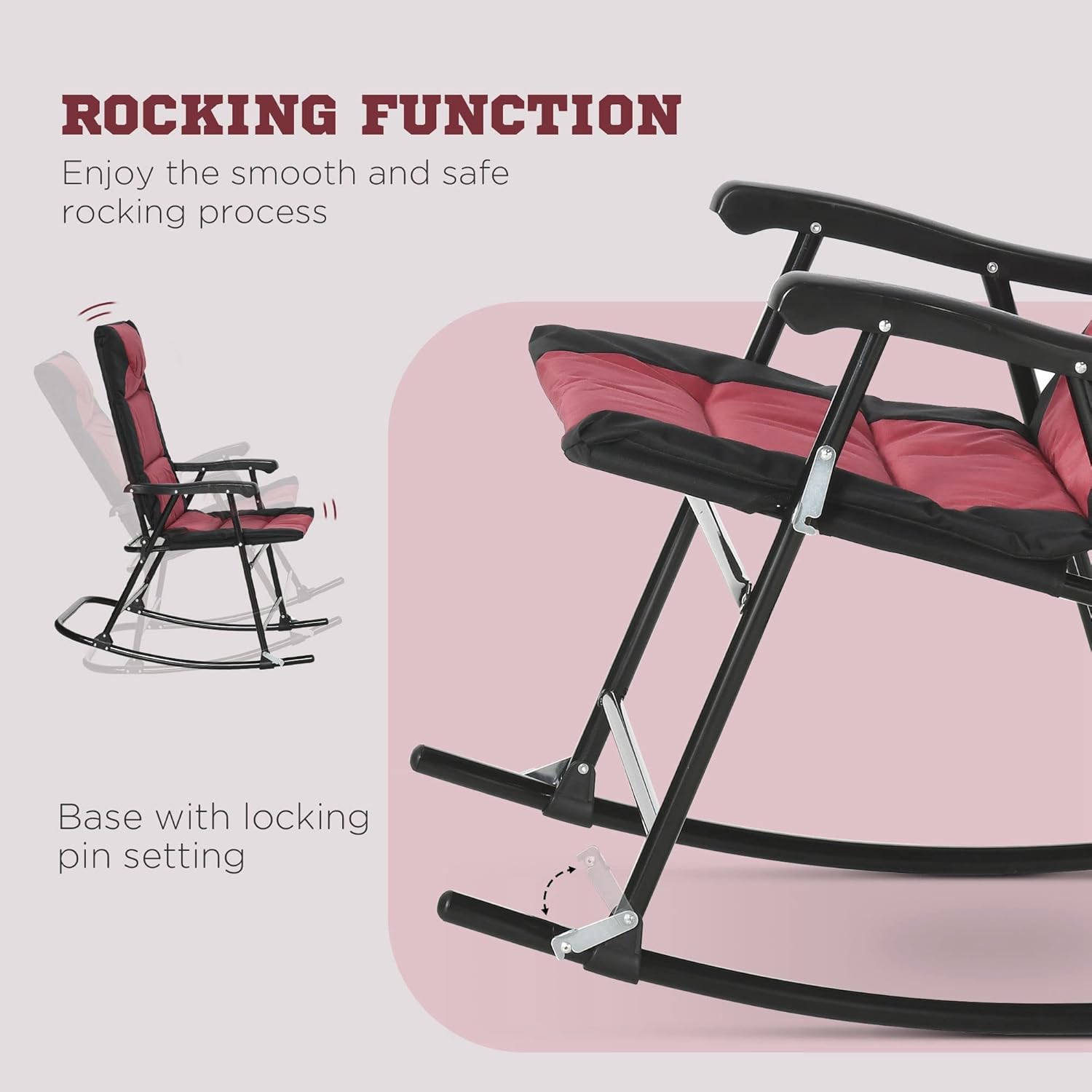 PATIO ROCKING CHAIRS: Rock out with a friend and relax. You can set up fast and enjoy the summer sun with two ergonomic armrests and a cushioned pillow headrest supported by a folding steel frame. The locking mechanism keeps your seating secure and ensures you won’t have to worry about it collapsing during your nap.