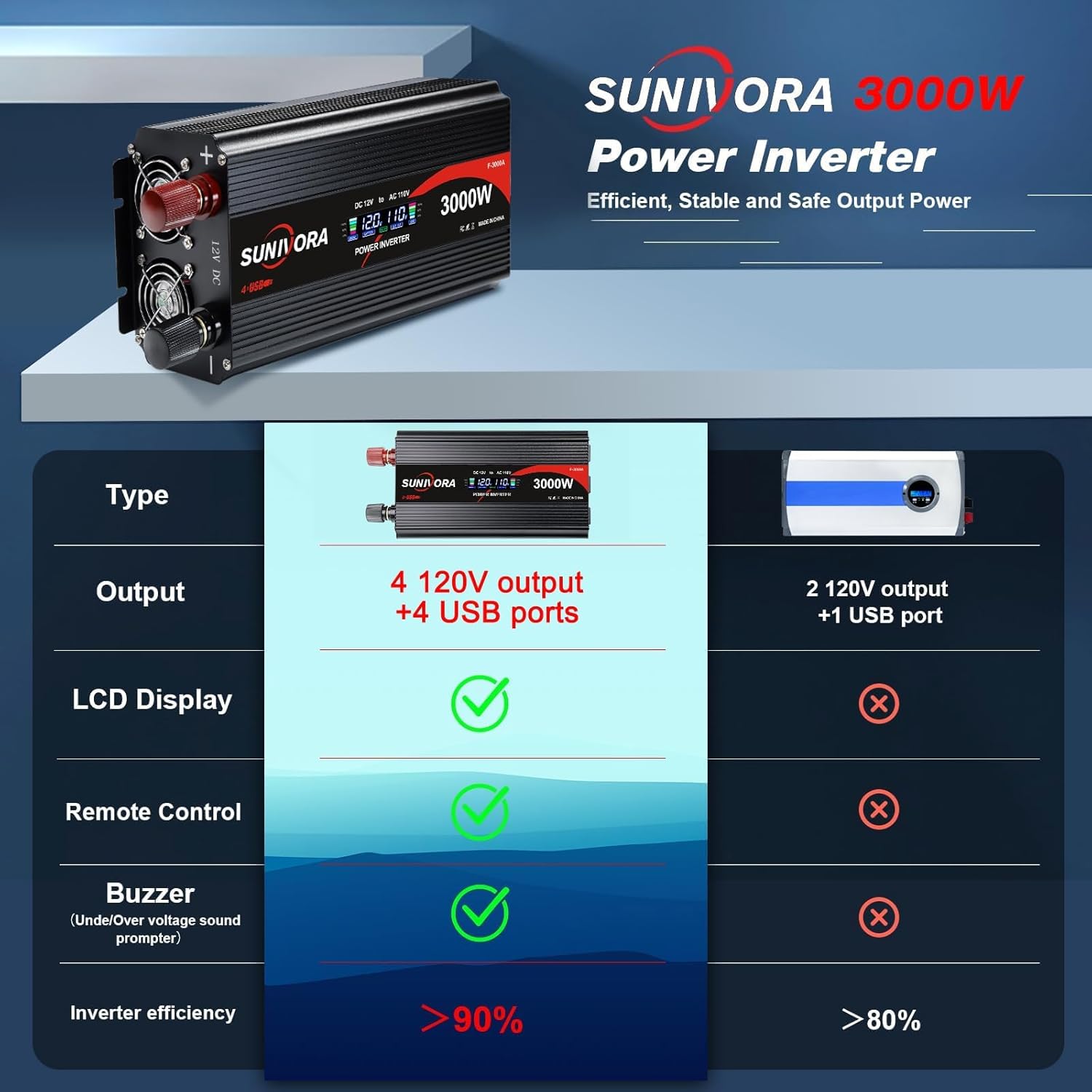[POWERFUL OUTPUT] Convert power of 12V DC to 110V/120V AC. Provides 3000 Watts continuous modified sine wave power and 6000 Watts surge power. Featuring 4 AC outlets and 4 USB ports for multi-purpose charging. Great High efficiency: conversion efficiency > 90%.