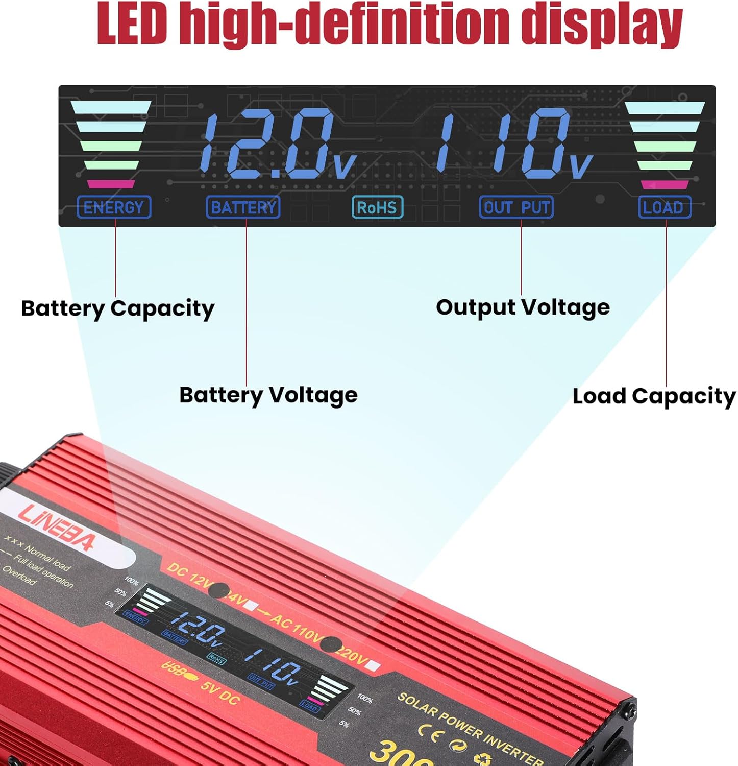 Lineba 3000 Watt Power Inverter with LED Display,Dual AC Outlets,USB Port, 12V DC to 110V AC Converter Car Power Inverter for Car, RV, Truck, Off Grid Solar System, Camping