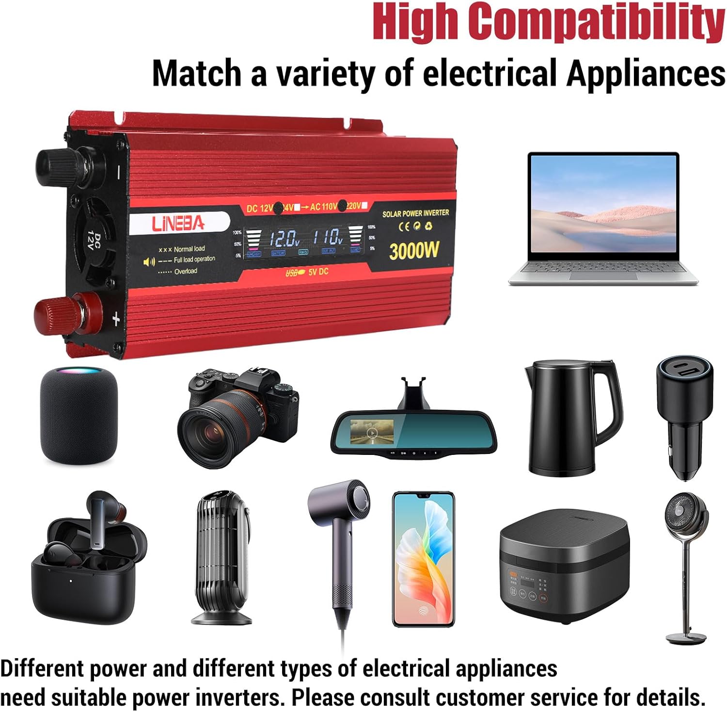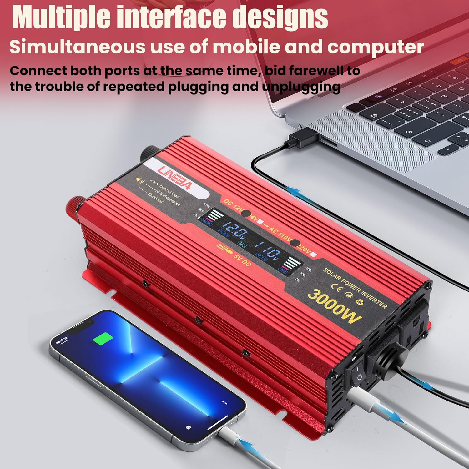 3000 Watt Vehicle Power Inverter: Lineba power inverter is a versatile device. Provides 420W continuous modified sine wave power and 3000W peak power. Use the terminal cables to connect the power inverter directly to a 12V battery power into AC 110V. Simply connect it to the car lighter to power laptops, cell phones, tablets, game consoles and more. It’s perfect for road trips, camping, power outages, emergencies and more. Lineba power inverter is the ultimate solution for portable power needs