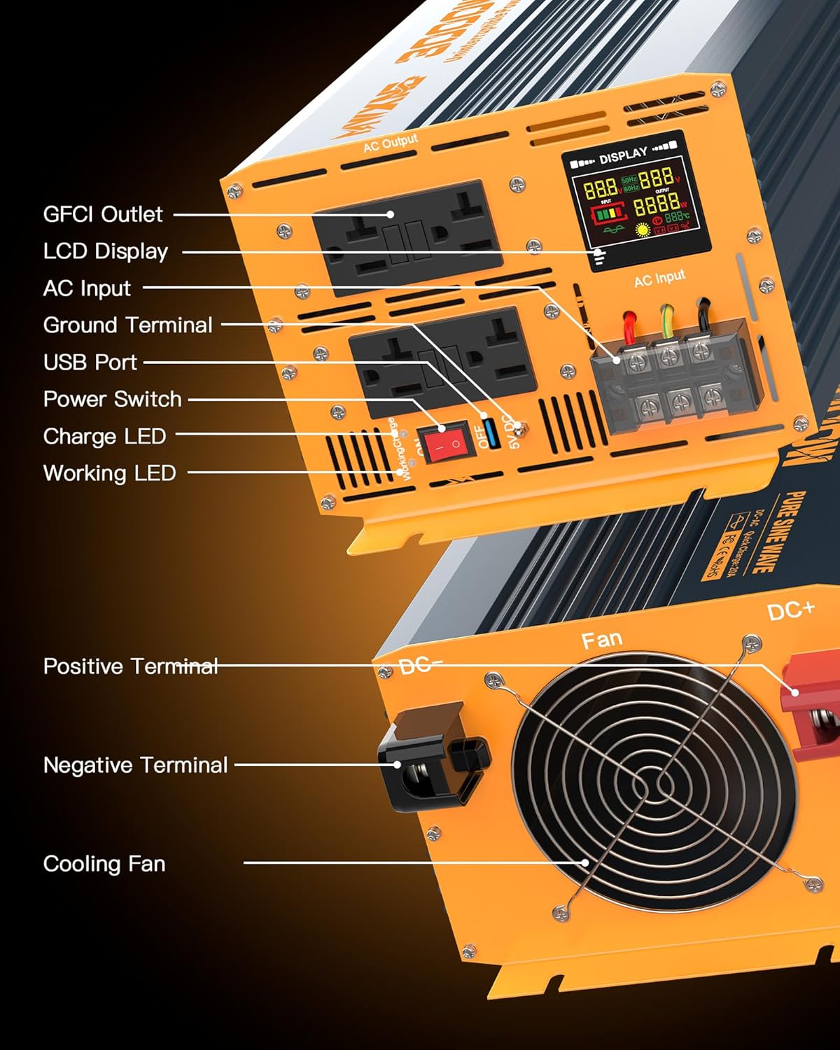 【FULLY SAFETY PROTECTIONS】 Our battery sump pump backup system is equipped with 4 GFCI outlets that swiftly cut off power to the circuit when a ground fault is detected, preventing electric shocks. It also has a built-in cooling system and self-recovering overload protector, offering various protection functions including under-voltage, over-voltage, overload, overheating, short circuit, and overcharge protection.