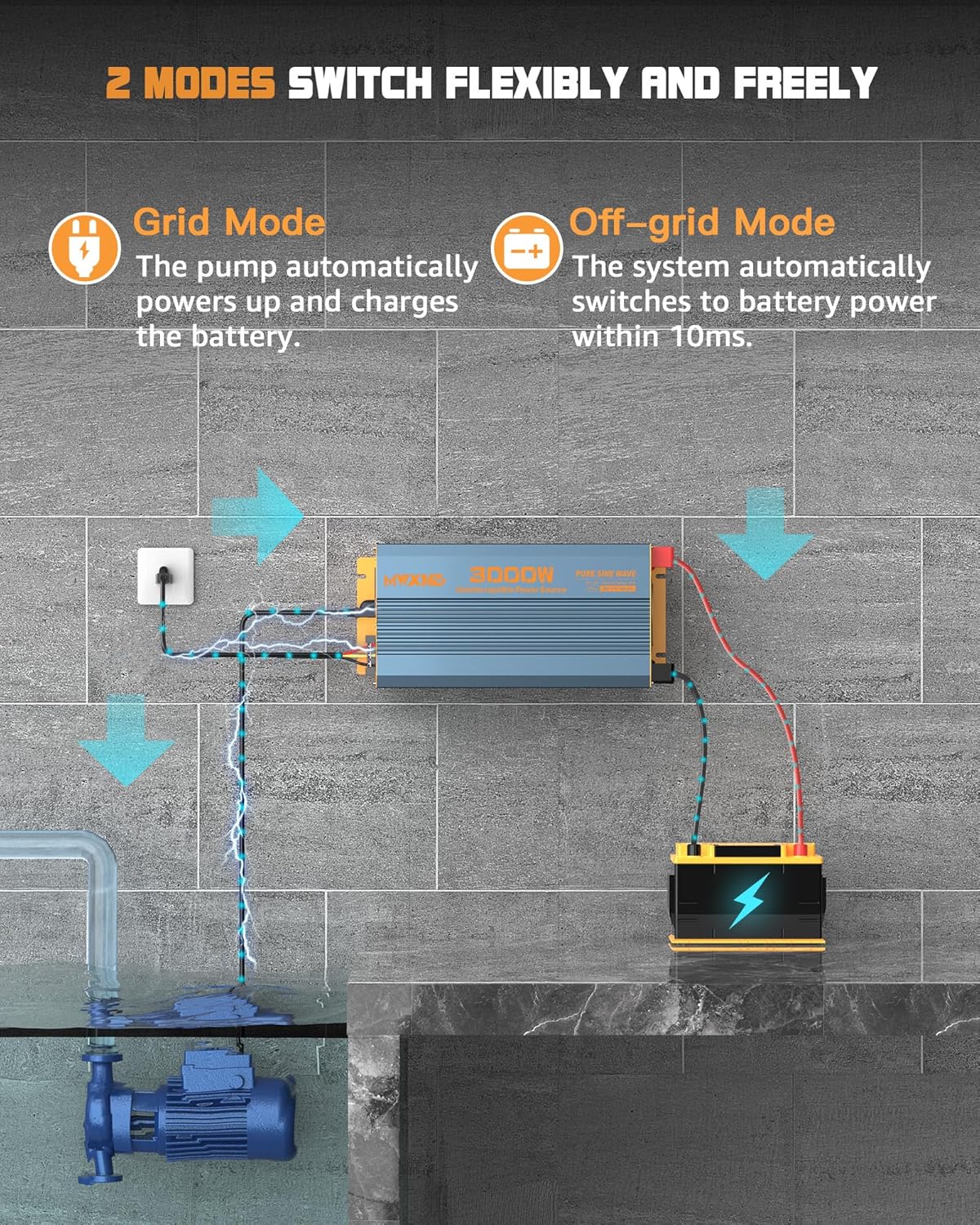 【EXCELLENT PERFORMANCE】 The battery backup for sump pump delivers a power output of up to 3000W and a current output of up to 27.5A, effortlessly supporting single and dual pump systems. MWXNE efficient backup inverter generates a stable pure sine wave 120 VAC waveform, ensuring a clean power source equivalent to grid power, preventing damage to electrical appliances.