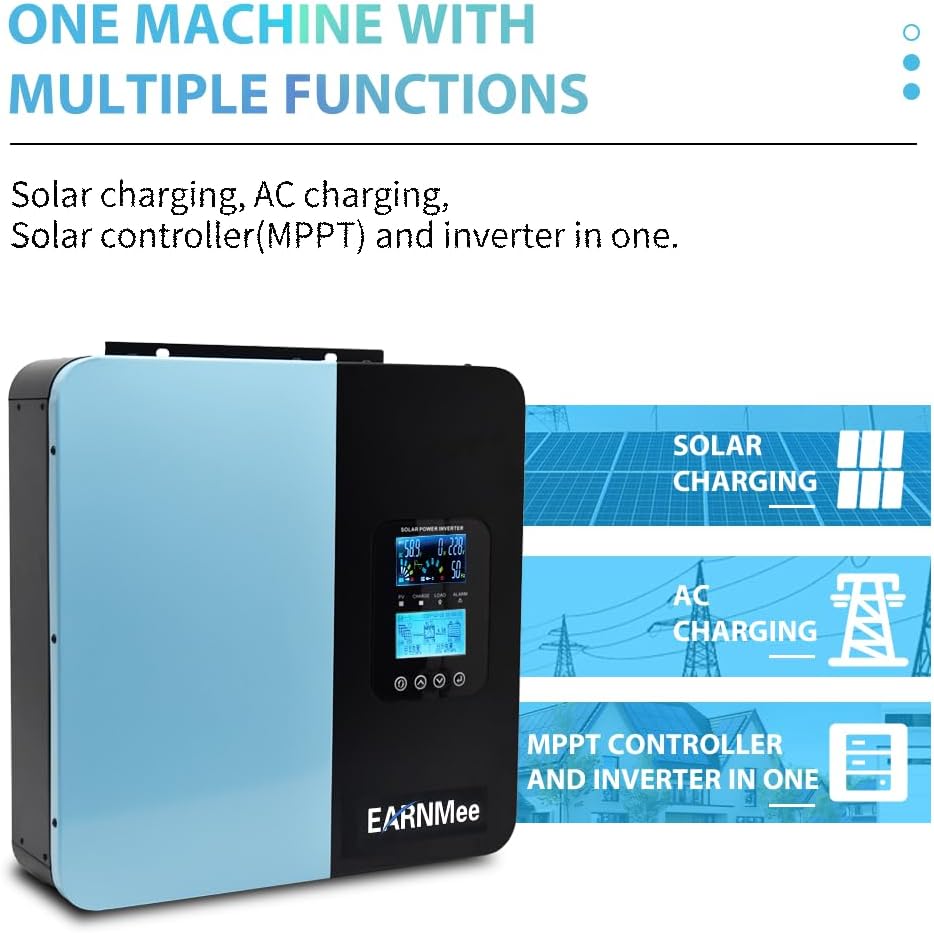 3000W Hybrid Solar Inverter Charger DC 72V to AC 110V / 120V Pure Sine Wave with 60A MPPT & Max PV Input 230V for Lead Acid/LiFePO4 Battery, Home Backup/RV/Off-Grid Power System