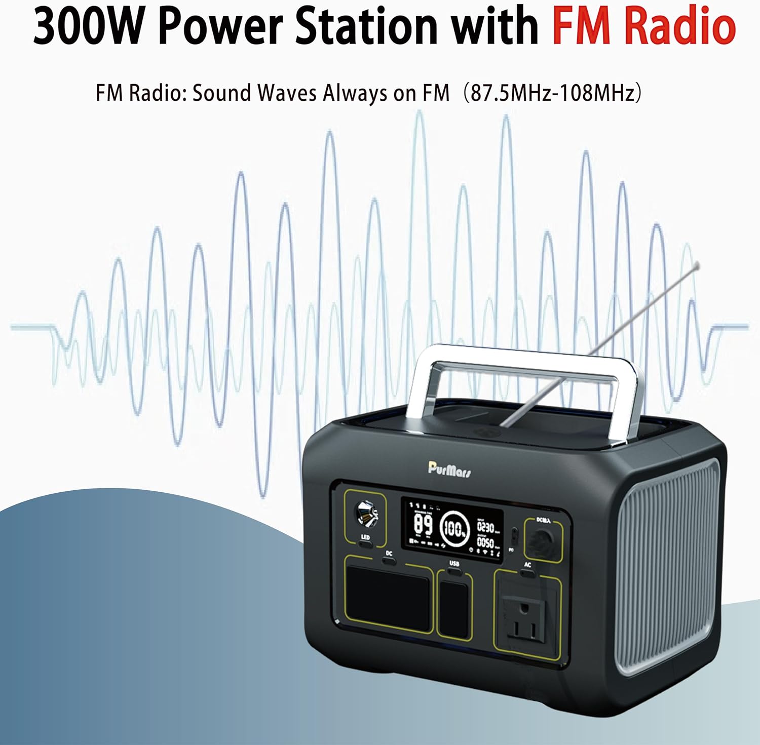 Full-Spectrum FM Radio:This portable power station for camping features an integrated FM radio with a 87.5MHz–108MHz frequency range, covering all standard channels for music, news, and emergency updates. Equipped with a high-sensitivity internal antenna, it delivers clear reception even in remote areas.Combined with the core functions of a 300W portable power station, it delivers even more convenience, safety and recreation programs for outdoor adventures or emergency.