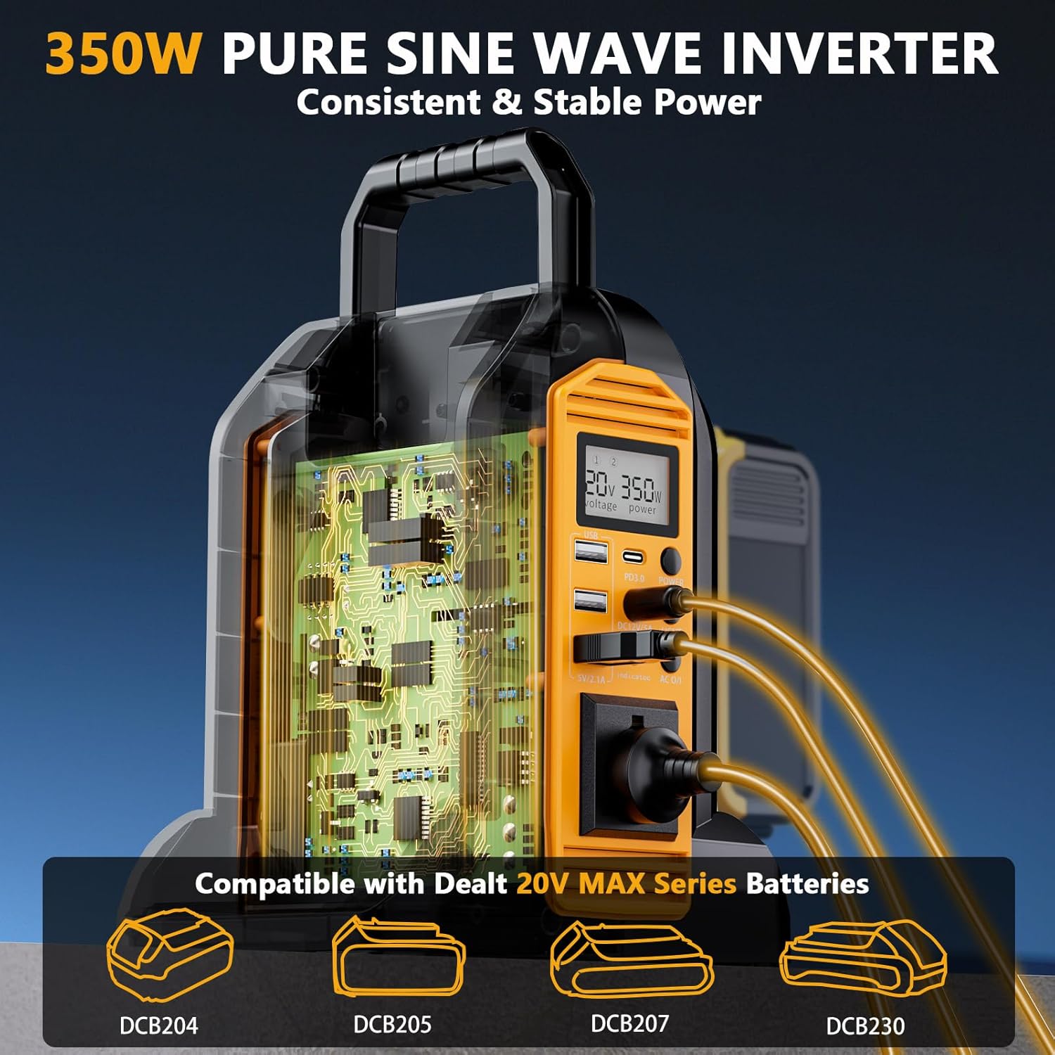 【Pure Sine Wave Inverter】 – Our power inverter delivers consistent and stable power, and efficiently transforms 20V DC from DeWalt 20V/60V batteries to 120V AC, Providing reliable power for various devices during outdoor activities.