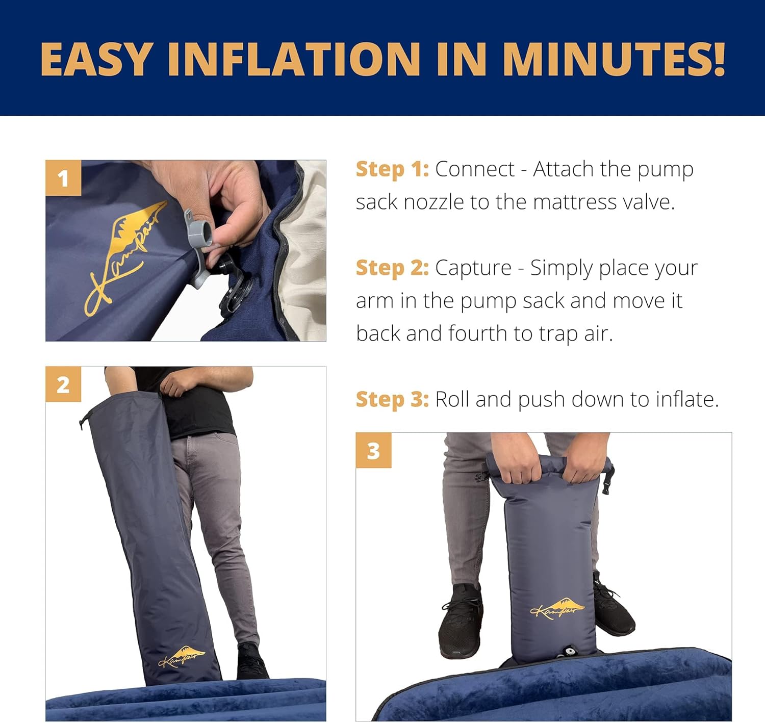 LARGE VOLUME, QUICK SETUP : No need to blow by mouth—enjoy a more hygienic and effortless inflation. With a large 35L capacity, it inflates any Kampair air mattress in just 5 to 7 pumps, making setup quick and easy