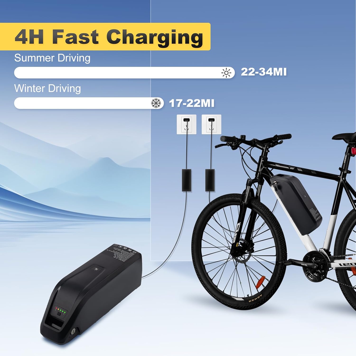 【High-Capacity Long Range Performance】With 720Wh of usable capacity, this power system delivers 22–34 miles of full-speed riding in summer and 17–22 miles in cold weather, depending on terrain and load. Energy replenishes quickly using the 42V 5A adapter, reaching full level in approximately 4 hours