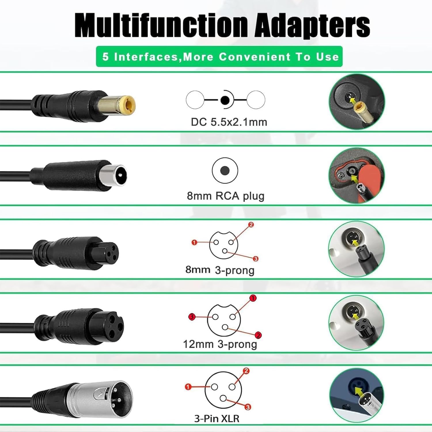 42V 2A Charger Universal 5 Plugs Replacement for 36V Lithium Battery, Pack DC 5.5 * 2.1 with 8mm 3 Prong /12mm 3 Prong /8mm RCA/3-Pin Male XLR Connector, Power Adaptor Supply Cord