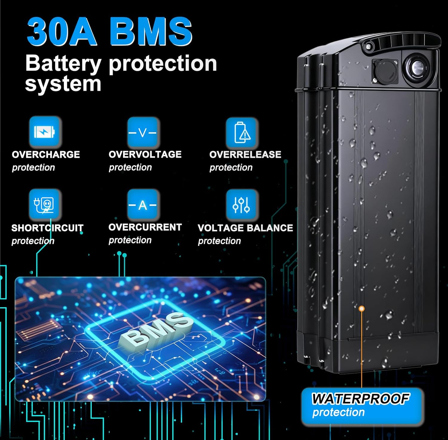 【Built-in 30A BMS】48V ebike lithium battery features an integrated 30A BMS protection board. It effectively prevents overcharging, over-discharging, over-current, and short-circuit conditions, ensuring stable and safe voltage performance.