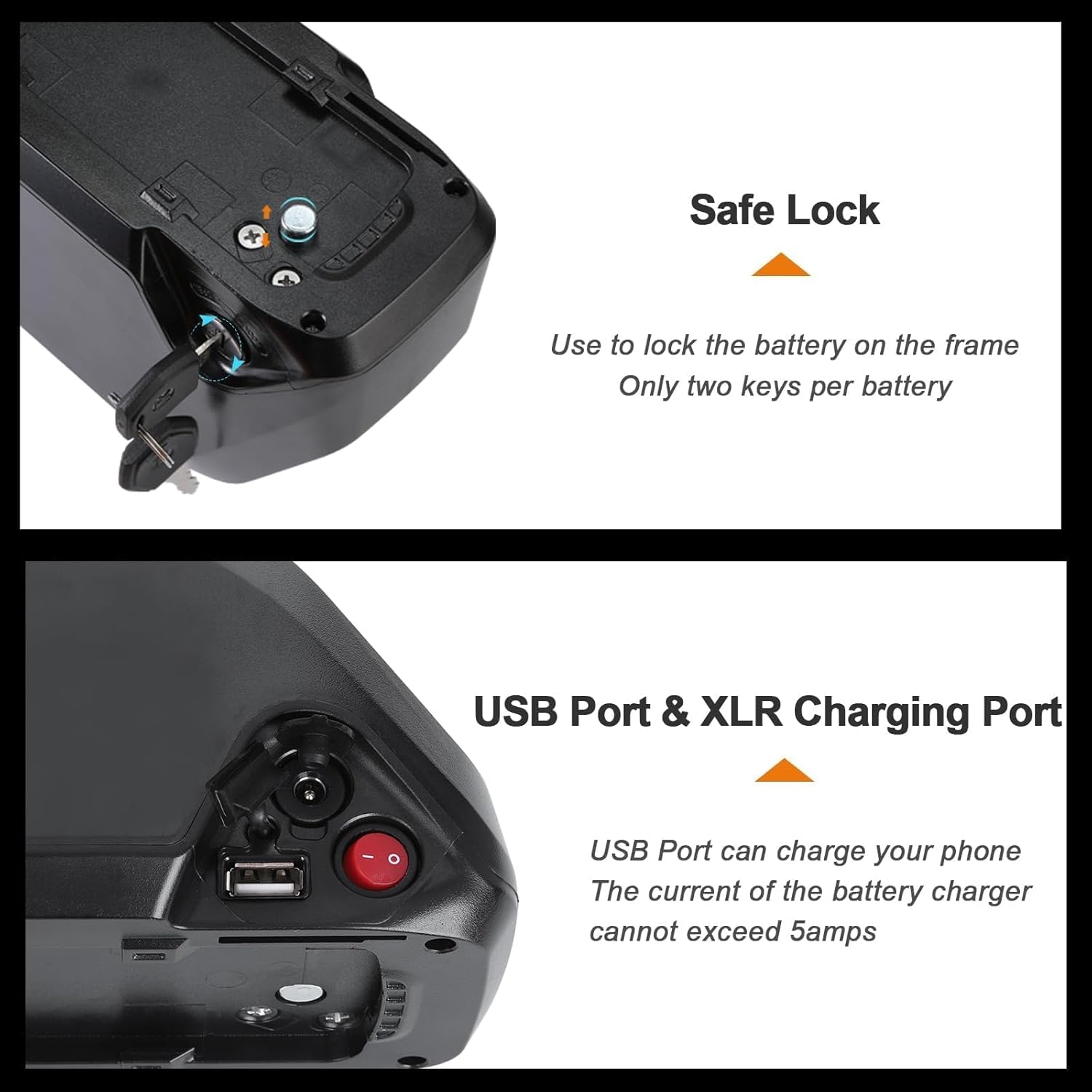 🏅🏅【Pack Includes】▶1 x 48V 15Ah Battery ▶1 x 3A Fast Charger ▶1 x Battery Holder Mounting Plate with Female XT60 Dis-charge Cable ▶1 x Male T Dis-charge Connector ▶2 x Keys▶2 x Anti Vibration Pads▶1 x User Manual ▶Note: ▶Anti vibration Pads:It has been glued onto the battery base.Protect the battery and reduce battery damage.▶This battery is equipped with only two keys, in order to safely leave a key at home to prevent the loss of the lock change.