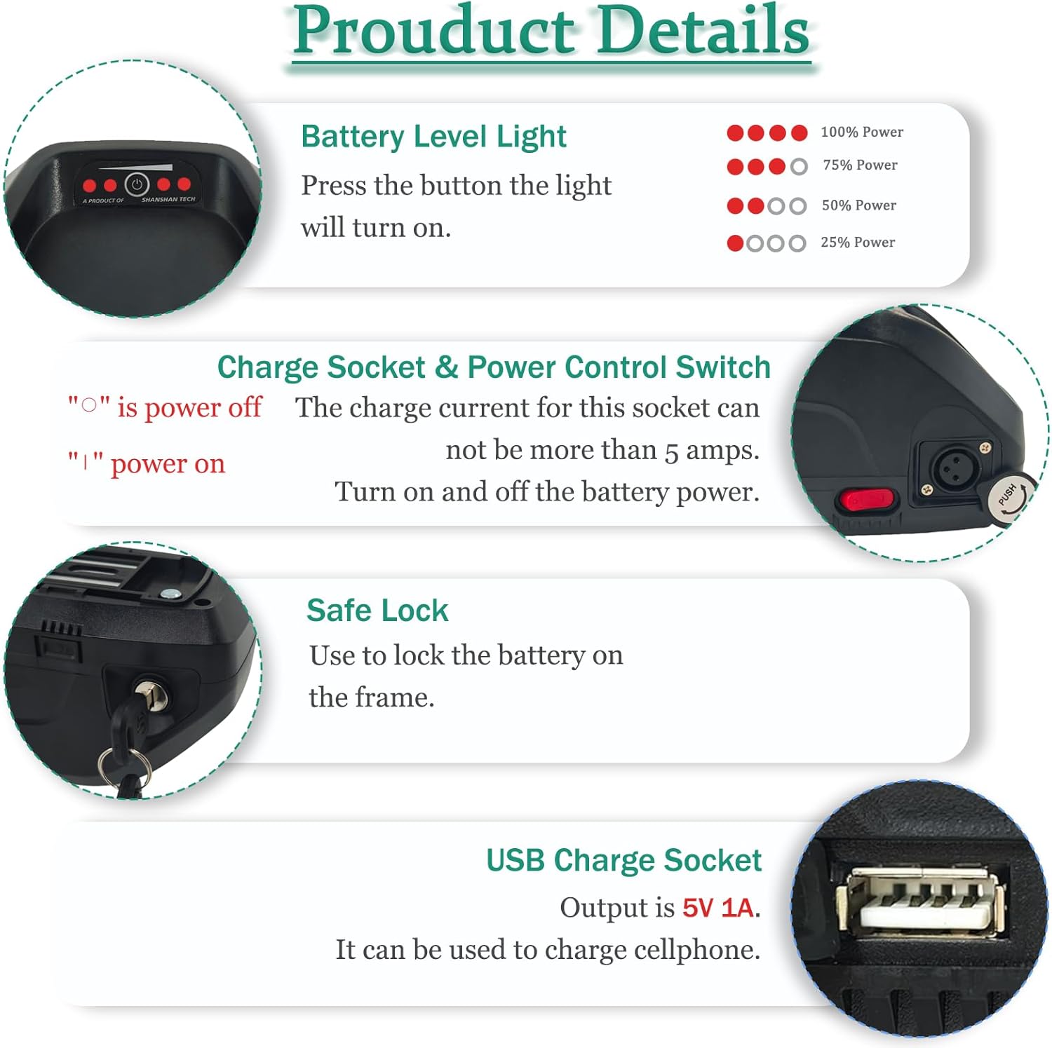 【48V Electric Bike Battery】Safe Lock: Anti-theft function. LED power Indicator: Real-time battery level detection,reminds you to charge the battery. Power Switch: Reduces battery power loss. Waterproof case: Reduces the possibility of damaging the internal battery.The 48V 16Ah electric bike battery can fit most motor kits. Best choice for adult electric mountain bike, commute ebike, hybrid bicycle, e trike, fat tire bike