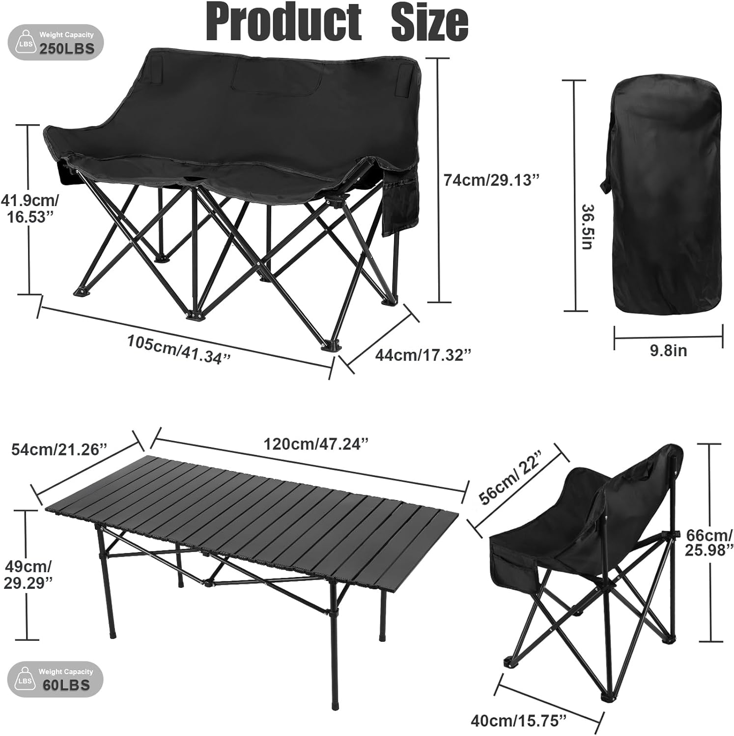 4Pcs Folding Table Chair Set – 1 Double Moon Chair, 2 Single Chairs & 1 Collapsible Table, Heavy Duty Portable Outdoor Set for Camping Hiking Travel Home Garden