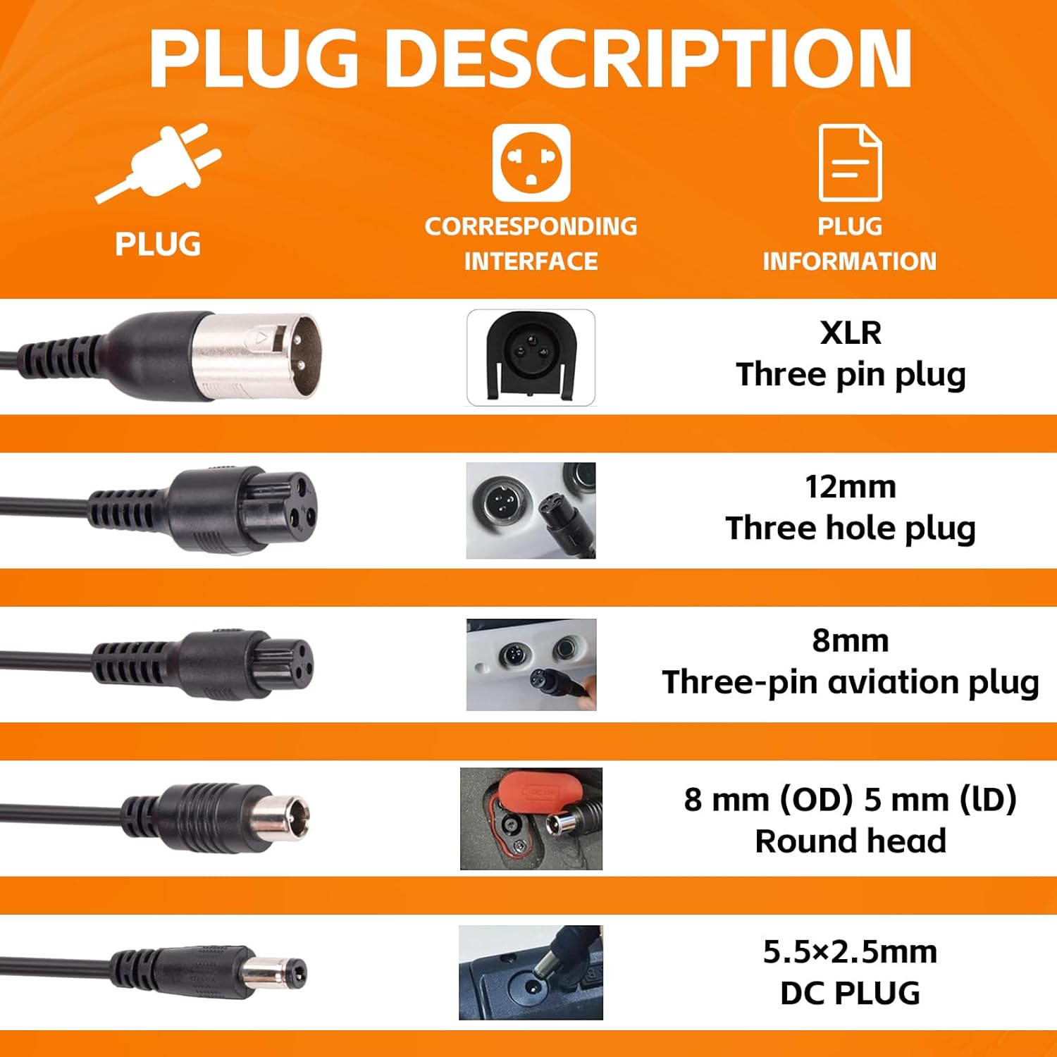 【Universal 5-in-1 Plug Design】 Comes with 5 types of plugs—5.5×2.5mm, 8mm 3-prong, 12mm 3-prong, XLR, and 8mm coaxial—making it compatible with most 48V/13S lithium battery-powered scooters, e-bikes, hoverboards, and wheelchairs.