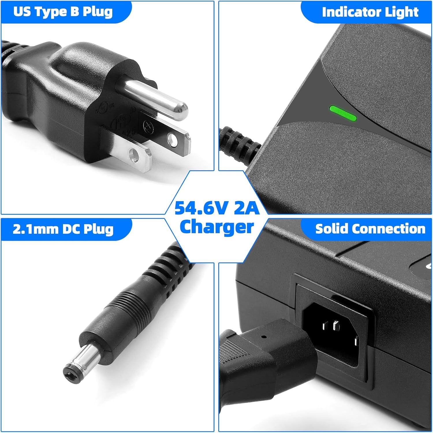 54.6V 2A Charger for 48V eBike Lithium Battery, UL& FCC Certified, Compatible with Lectric XP 1.0/2.0/3.0, Himiway Cruiser, Ride1Up Core-5, Multiple Security Protection 2.1mm DC Plug Power Adapter