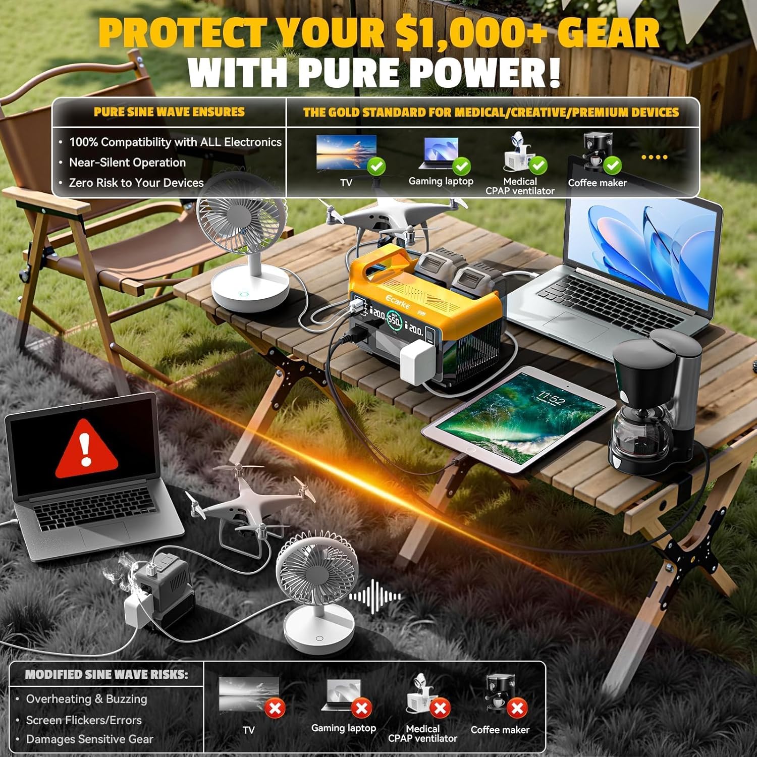 Yes, it’s essential for sensitive electronics like laptops, medical devices (CPAP), phones. Pure sine wave provides clean, stable power like your home outlets, preventing damage and ensuring optimal performance. Modified sine wave can harm devices.