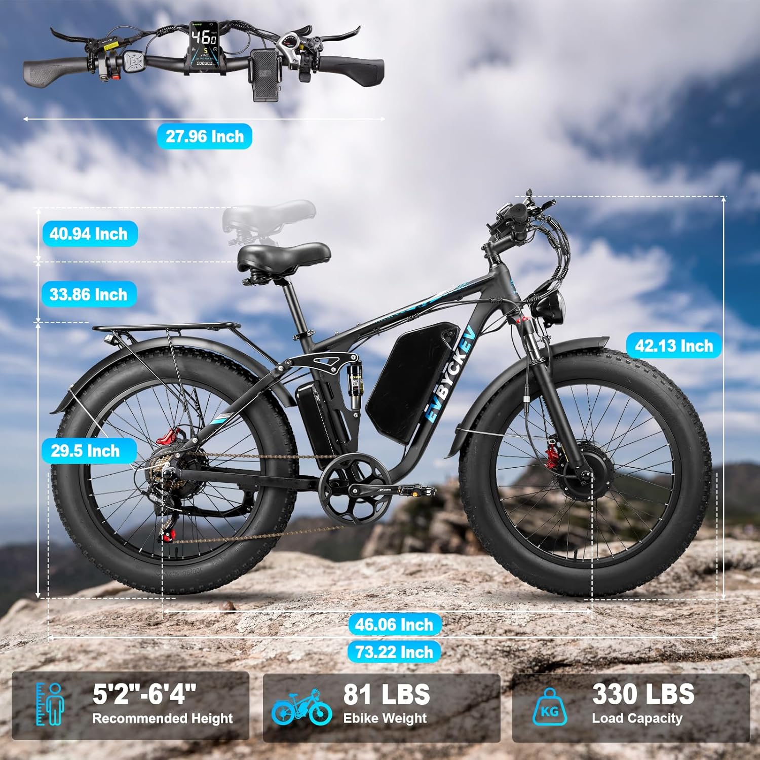 【Professional Full Suspension & 24″ Fat Tires】The electric mountain bike features lockable adjustable front forks and rear hydraulic suspension paired with high-intensity ventilated seat—crushing bumps and reducing impact for buttery-smooth rides, delivering superior shock absorption and reduced impact for smoother rides. The rugged 24″x4.0 fat tires effortlessly grip snow, sand, and mountain trails while maintaining agile street control.