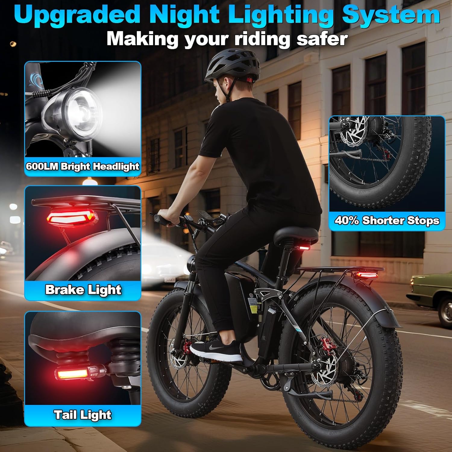 【Reliable Ebike】The fat tire electric bike is crafted from high-quality 6061 aluminum alloy, making it sturdy, durable, and capable of supporting up to 330 pounds. The electric bike is equipped with a super-bright 600-lumen LED front light, a flashing light, and a tail light to enhance visibility and safety during night rides.