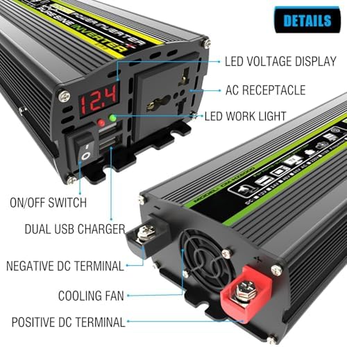 6000W Power Inverter: This versatile power inverter delivers 1000W continuous power and 6000W peak power, making it ideal for various applications. It includes a free cigarette lighter and two battery clips for easy connectivity. Perfect for camping, emergencies, or powering devices on the go. Ensure the total rated power of connected devices is ≤ 1000W for optimal performance.