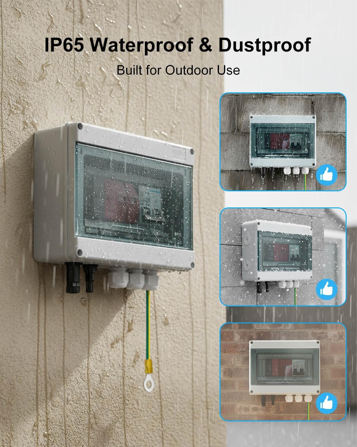 Built with two 32A DC fuses, a high-voltage lightning arrester, and a 63A circuit breaker, it provides comprehensive protection against short circuits, surges, over-voltage, over-current, and grounding issues—ensuring long-term safety for your solar panels and inverter.