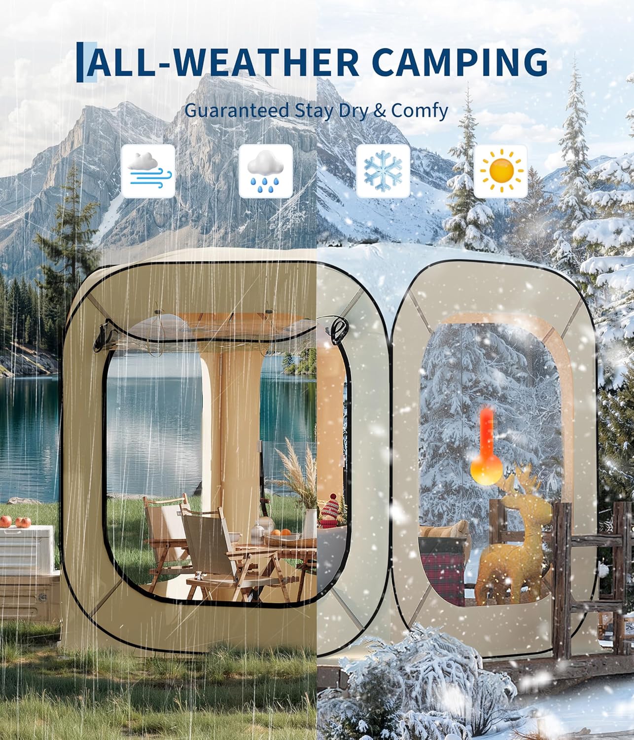 Year-Round Outdoor Comfort: This all-season tent offers windproof, rainproof, and snowproof protection, letting you enjoy outdoor fun freely through every season, no matter the weather. Equipped with closable doors and windows, it seals out harsh elements like wind and rain. Perfect for backyards or patios, it provides private space while keeping outdoor furniture dust-free.