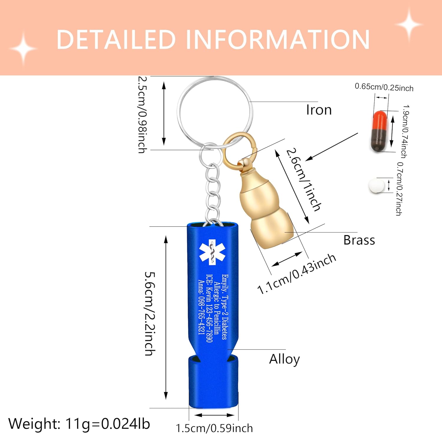 3.Size: Whistle measures 5.6×1.5cm (2.2×0.59in); calabash calabash measures 2.6×1.1cm (1×0.43in); total weight 11g