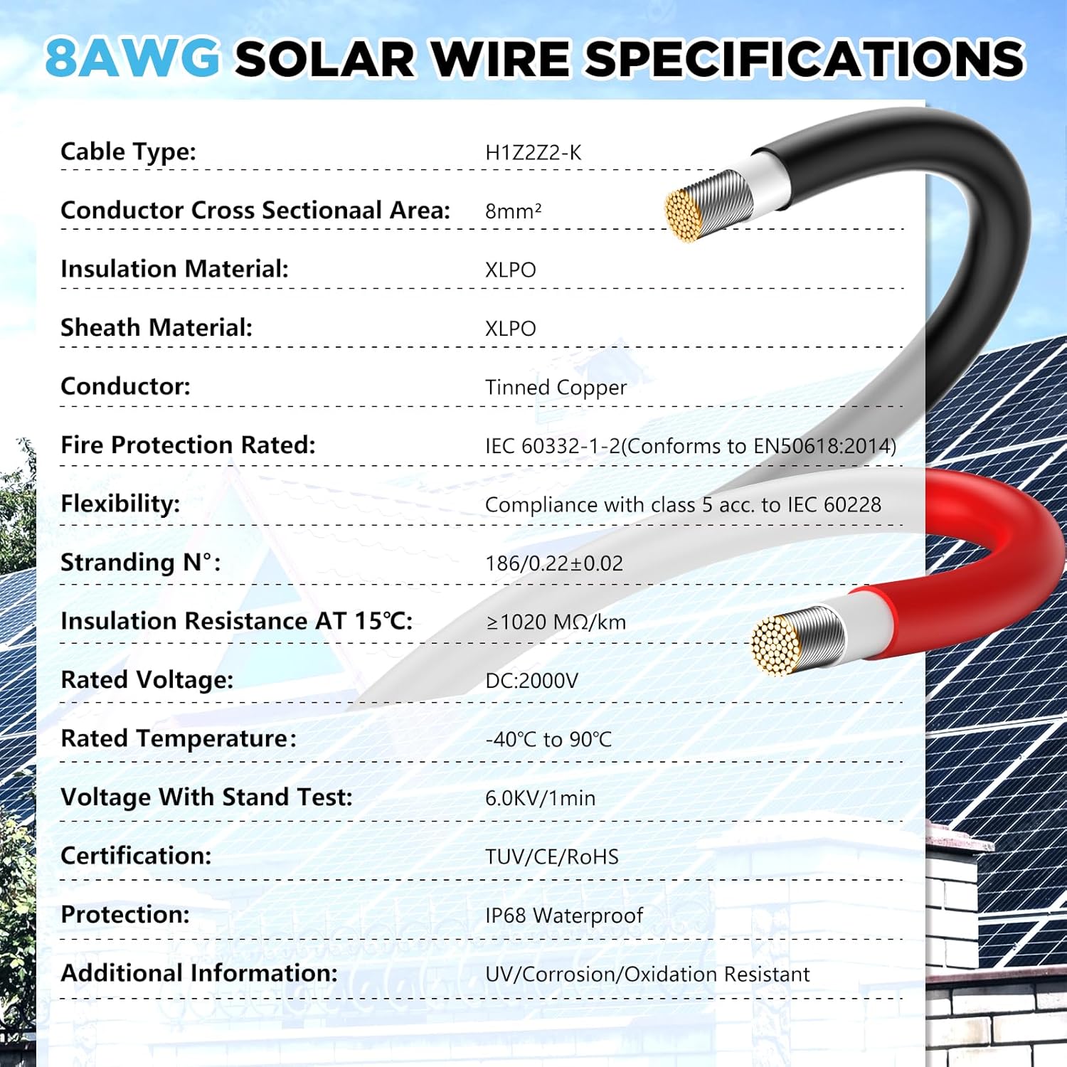 🍀【Technical Data Cable Solar 8AWG】: Professional pv wire 8awg 30 feet solar cable, TÜV, CE, RoHS certification, IEC 62930 and IEC 60332, Cross-sectional area: 10mm², Temperature range: environment -40℉ to 248℉, DC:2000V, Rated current:40A(Max.55A), Conductor resistance: (15°C) ≤1020Ω/KM, Strands N°: 186/0.22±0.02mm, Weather resistance, UV-proof, Anti-aging, Moisture-proof and Corrosion-resistant.