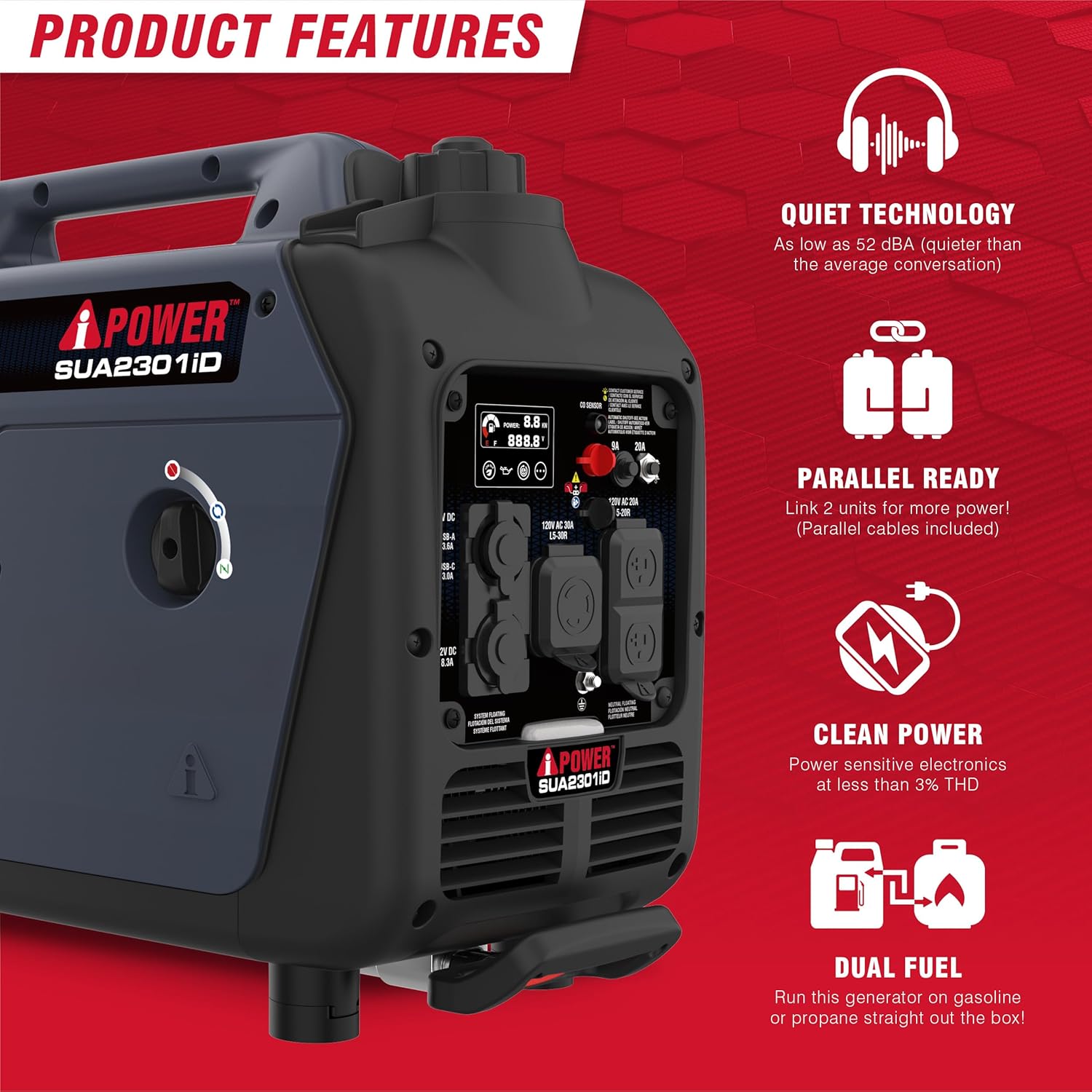 A-iPower 2300-Watt Portable Inverter Generator Dual Fuel, RV Ready, CARB Compliant CO Sensor, Light Weight With Telescopic Handle For Backup Home Use, Tailgating & Camping (SUA2301iD)