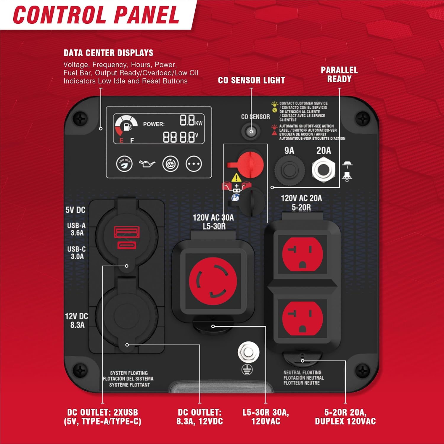 Multi-Featured Control Panel: The control panel consists of CO sensor indicator light, LED light, data center display, 2x USB 5VDC, 1x 8.3A 12VDC, 1x L5-30R 30A 120V, 1x Duplex 5-20R 20A 120V.