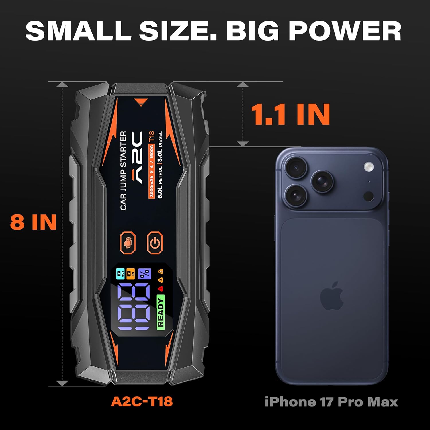 POWERFUL JUMP STARTER: The A2C car battery jump starter quickly revives 12V vehicles, including SUVs, motorcycles, trucks, pickups, ATVs, UTVs, lawn mowers, and more. Safely start gas engines up to 6.0L and diesel engines up to 3.0L. The portable car jump starter for everyday emergencies.