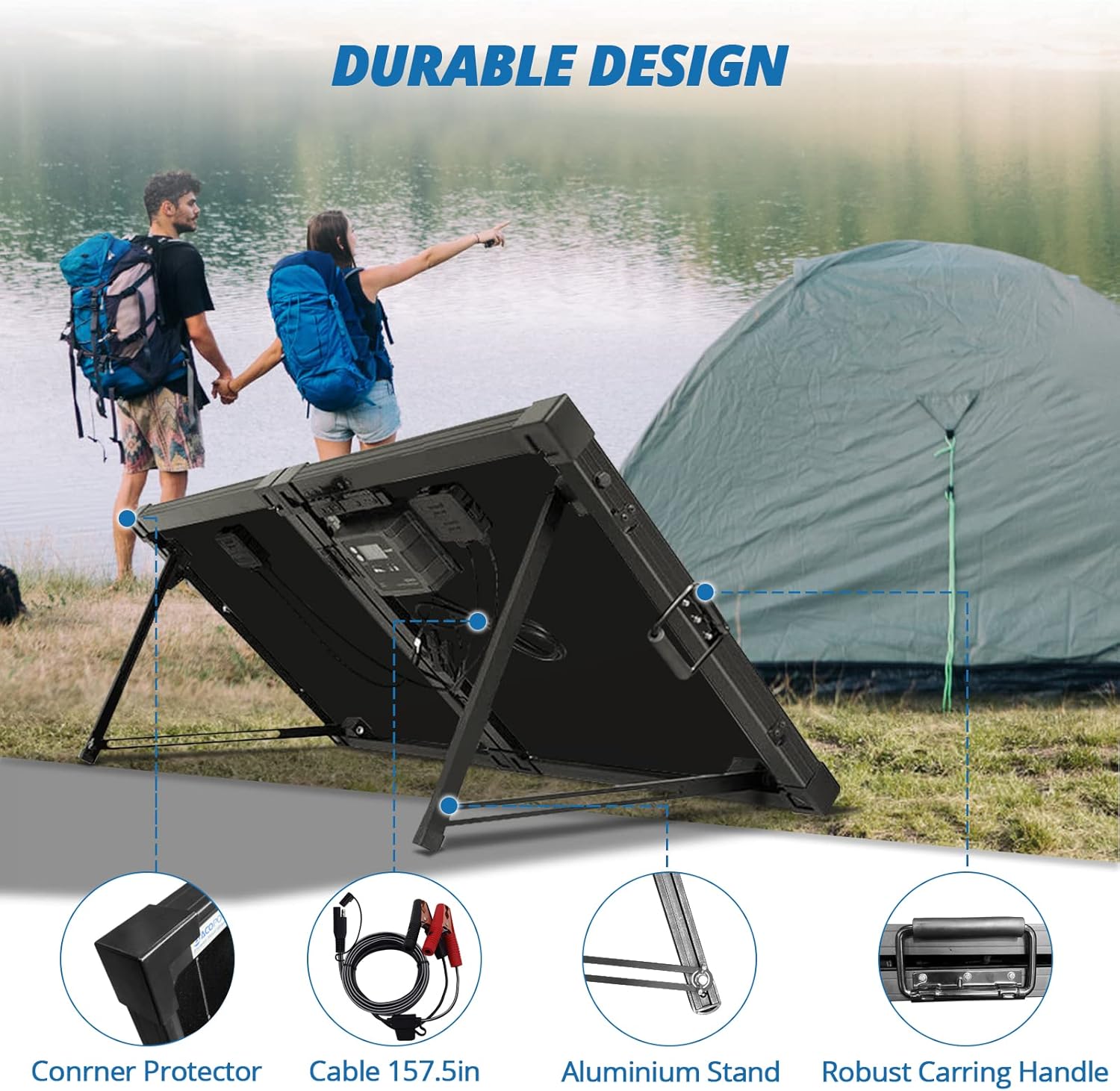 【Plug and play solar kit】A 100W solar suitcase, a 20A waterproof charge controller.Features 2 kickstands for stable setup on any surface.Quick setup in seconds. Reliable TPE rubber handle for easy carrying on adventures.