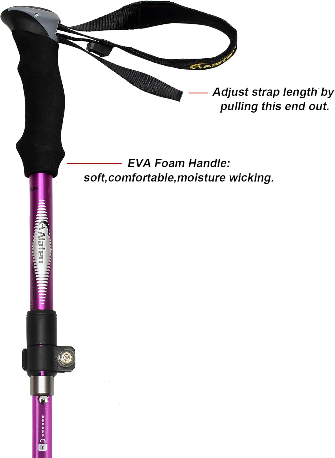 1)Sweet-absorbent EVA Handle:Using EVA foam material,and a non-slip groove design, comfort grip, strong non-slip and sweat-absorbent2)Comfortable Strap:Quick-drying fabric wrist strap, comfortable,breathable, fit the wrist, adjustable flexibly3)Strong Shaft is made of super tough 7075-T6 aircraft grade aluminum alloy. This alloy is often referred to as the strongest aluminum alloy because it has the strength of many steels, while retaining aluminum’s lightweight qualities. The surface of the alloy is created through an advanced oxidation process. It is very hard and protects the metal from weathering and corrosion4)Tungsten Steel Tip is extremely hard and excellent for use on the roughest hiking trails. Included also are a Rubber Point Cover for use on pavement and a Snow Saucer for use in snow