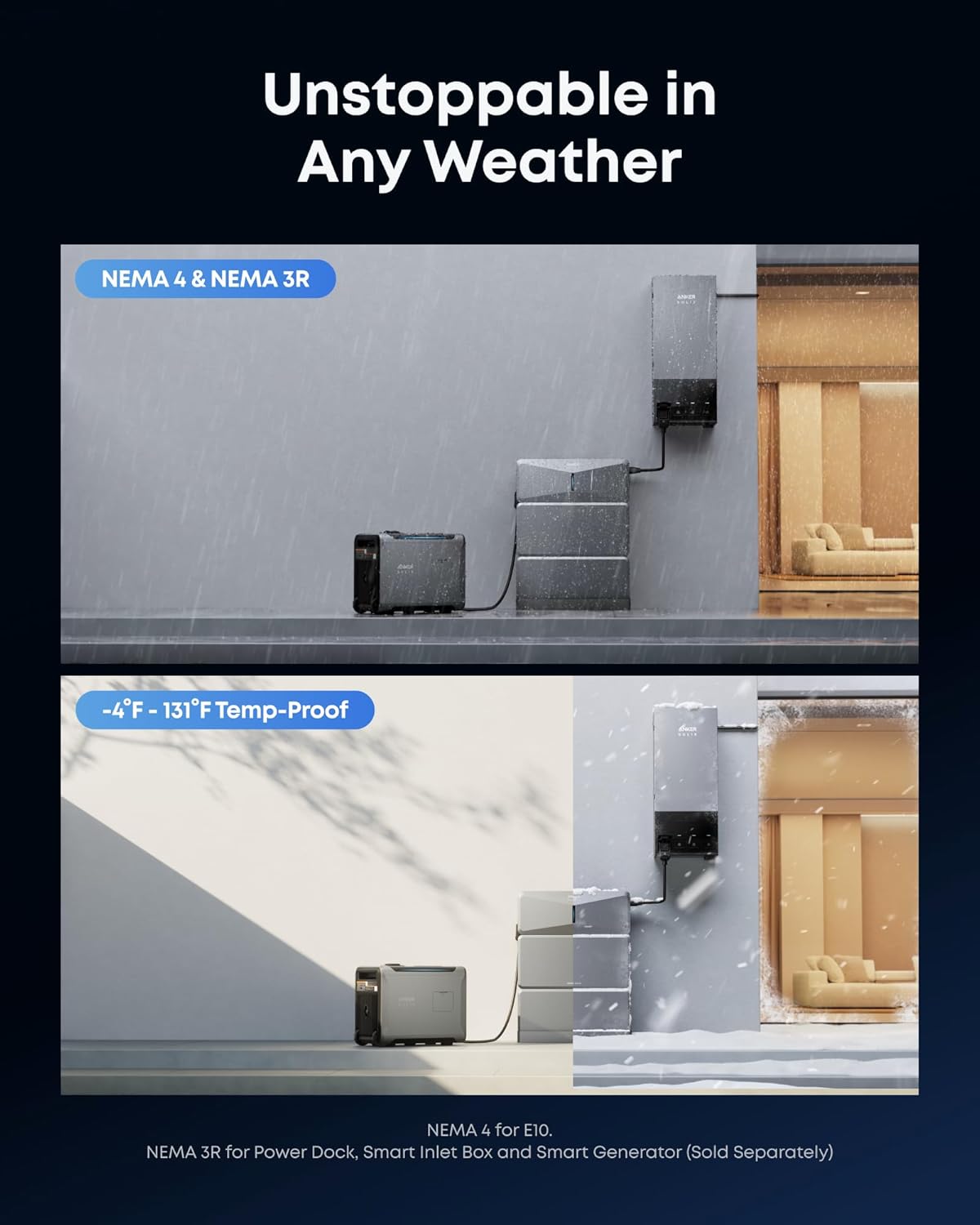 Built to Last: Weatherproof outdoor use without shelter. NEMA 4, -4°F to 131°F. EV-class LFP batteries, 10-year lifespan, 5-year warranty.